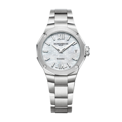 「スイスメイド」のクォーツムーブメントを搭載したこのリヴィエラは、マザーオブパールのダイヤル、ベゼルには4個のダイヤモンドをセット、メタルブレスレットを組み合わせた明るい雰囲気のタイムピースです。積極的なパーソナリティの方にお勧めします。
