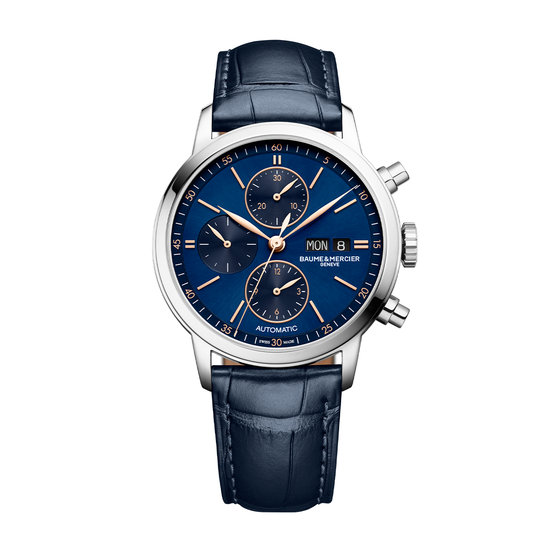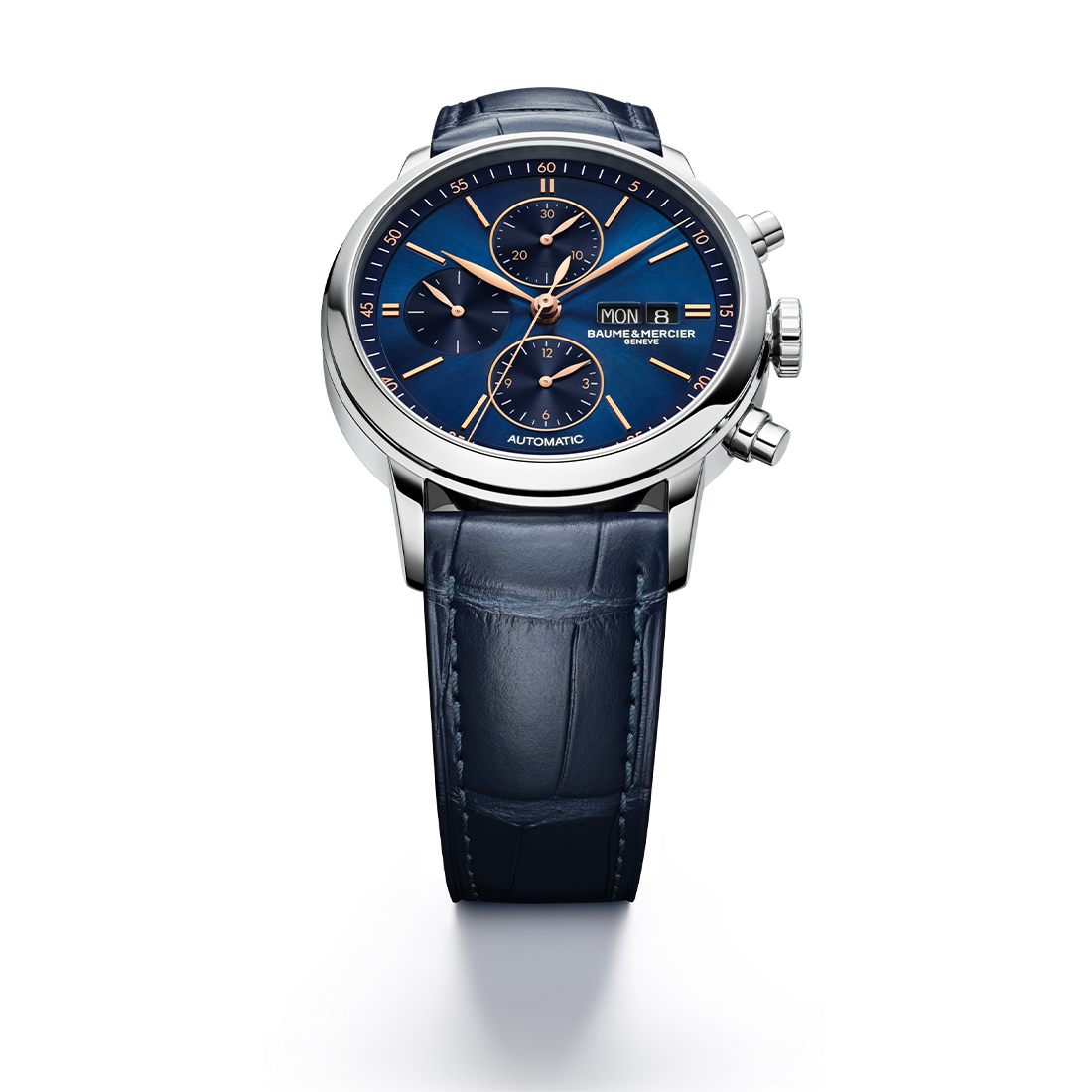 クラシマ M0A10784 は、細部まで作り込まれたデザインエレメントが洗練さを象徴しています。サンバースト仕上げが施されたブルーのラッカー仕上げのダイヤルに、ダークブルーのサブダイヤル、そして繊細なゴールドのアクセントがエレガントな美しさを際立たせます。洗練されたゴールドのインデックスとリーフ型針が高級感を感じさせ、3時位置の曜日・日付窓が機能性、利便性を提供します。