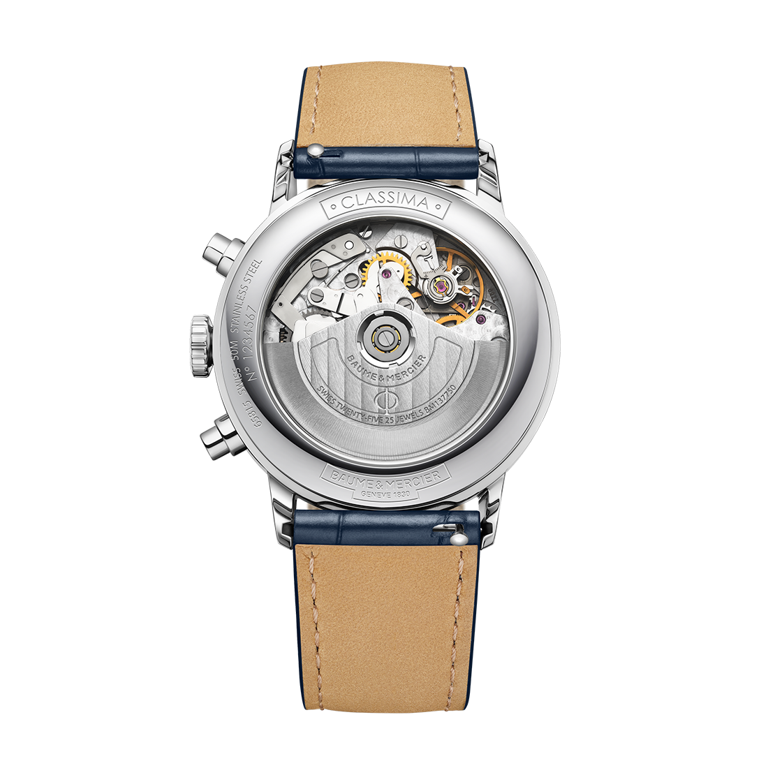 付属のブルーアリゲーターストラップとインターチェンジャブルなステンレススティール製バックルにより、快適さと安全性を実現しました。