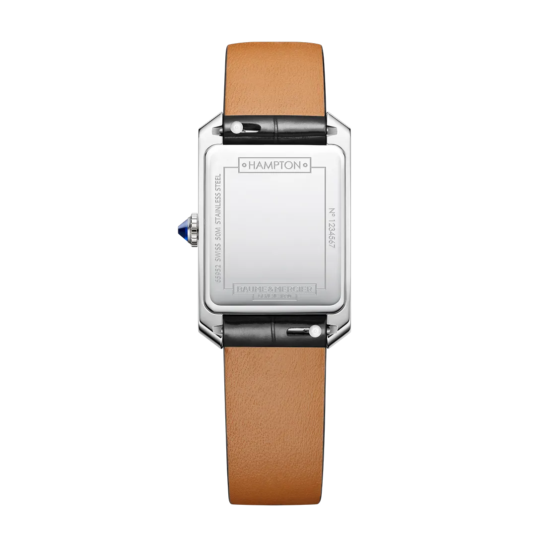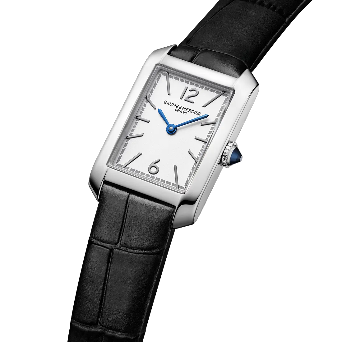 ハンプトン10795はシルバーホワイトのオパーリン文字盤に、ロジウム仕上げリベット留めのアラビア数字とインデックス、ブルーの剣型針があしらわれています。ポリッシュ仕上げのステンレススティール製長方形ケースには、ブルーの人工スピネルを嵌め込んだスティール製カボション型リューズがついています。交換可能なアリゲーター柄のブラックレザー ストラップは、工具なしで交換できる信頼性の高いシステムを備えています。