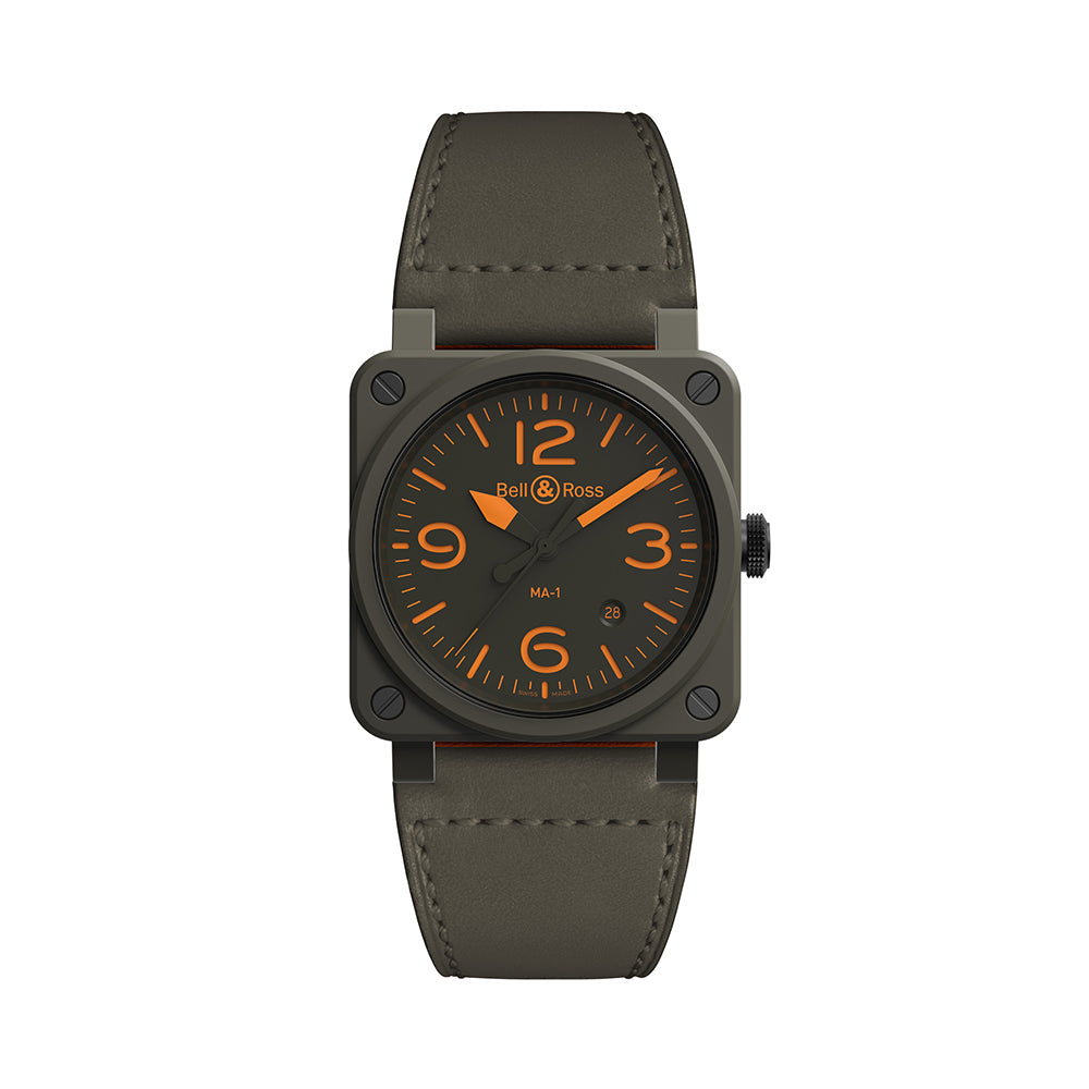 マットカーキ セラミック 文字盤: 文字盤は 2 層のプレートによる構成 マットカーキの上段プレートは数字とインデックスの部分がカットされ、そこから見える下段プレートはオレンジの スーパールミノバ® がコーティング オレンジのスーパールミノバ® をコーティングした針 ストラップ: ブラックラバー&ブラックのヘビーデューティー仕様シンセティックファブリック製ストラップ ピンバックル 「ガン」PVD* コーティング ステンレススティール |