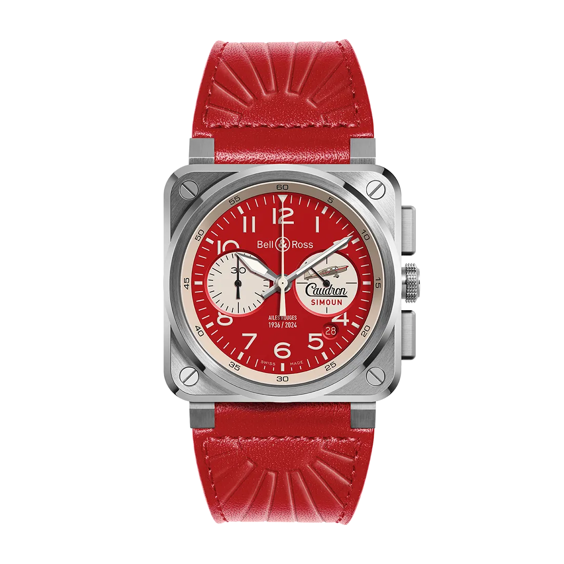 ベル&ロスは航空への情熱から1994年に設立されたブランドで、航空に特化した時計を数多く発表してきました。この「BR-03 クロノ エル ルージュ」は、復元予定の「コードロン・シムーン」のカラーを採用し、情熱的な赤いダイヤルやストラップでデザインされています。ダイヤルには1936年と2024年の年号が記され、スモールセコンドには「コードロン・シムーン」のイラストが描かれています。
