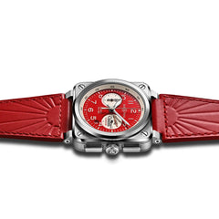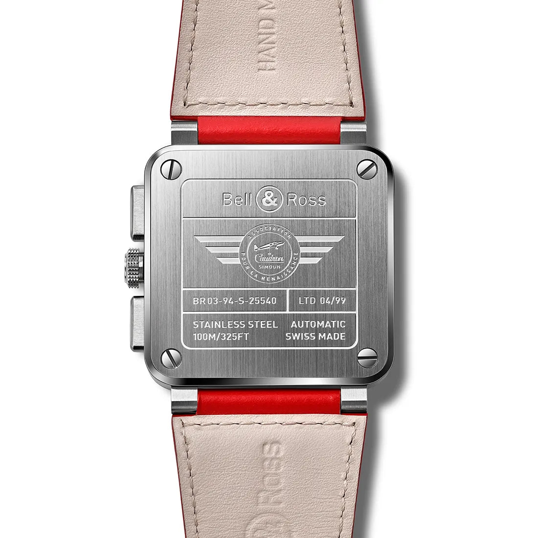 赤いBR-03 クロノ エル ルージュは、日本限定のクロノグラフモデルで、「赤い翼(Ailes Rouges)」を意味する名前が付けられています。このモデルは、1936年のフランス人飛行士アンドレ・ジャピーによる歴史的な航空挑戦を讃え、日仏共同プロジェクト「赤い翼」にインスパイアされています。
