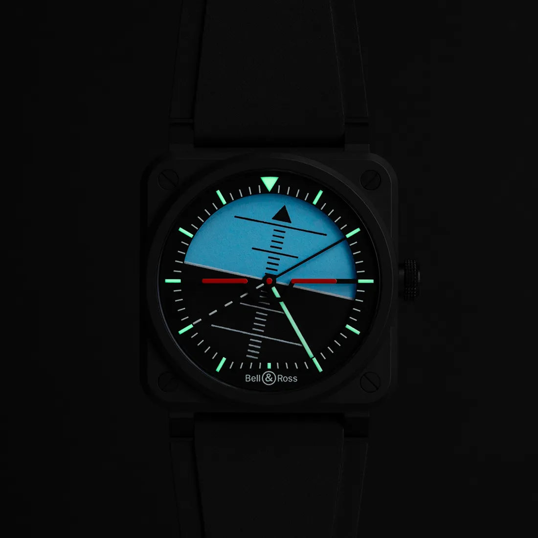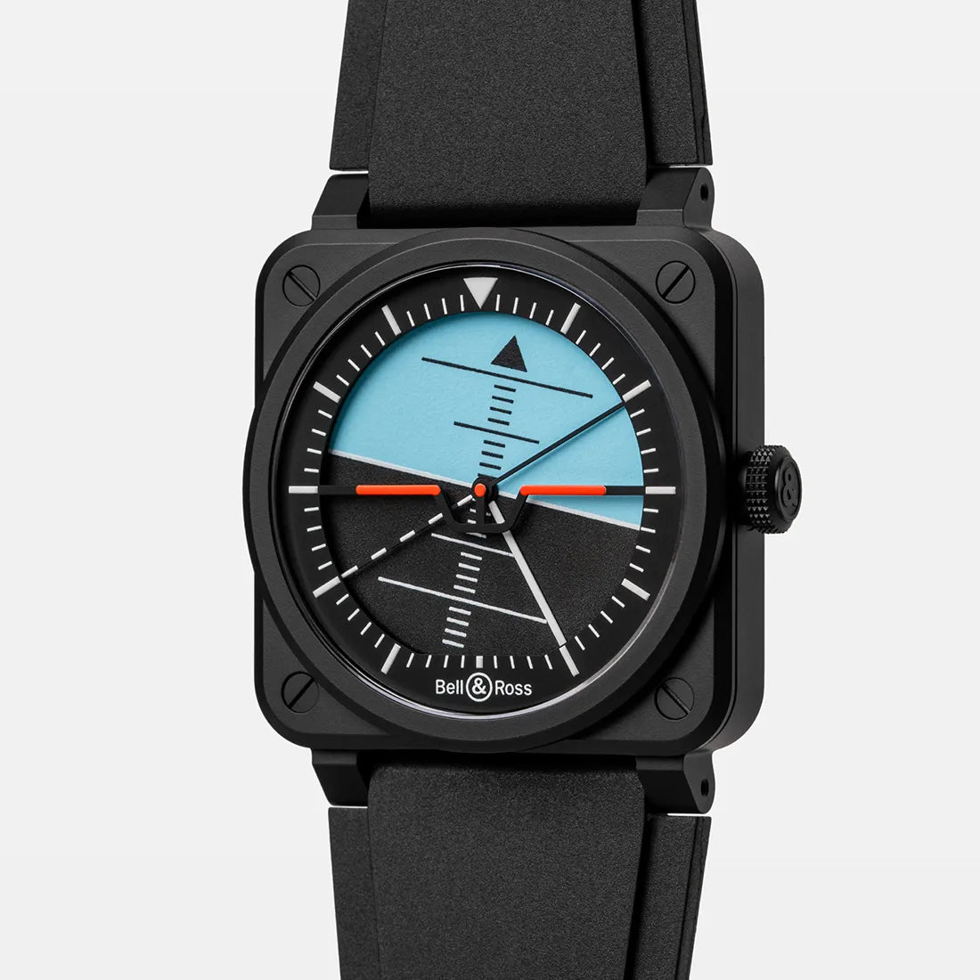 計器時計のスペシャリストである Bell & Ross の BR-03 Horizon は、航空機のコックピットにインスピレーションを得ており、視界ゼロの飛行に対処するために使用されるジャイロスコープを連想させる象徴的な文字盤となっています。