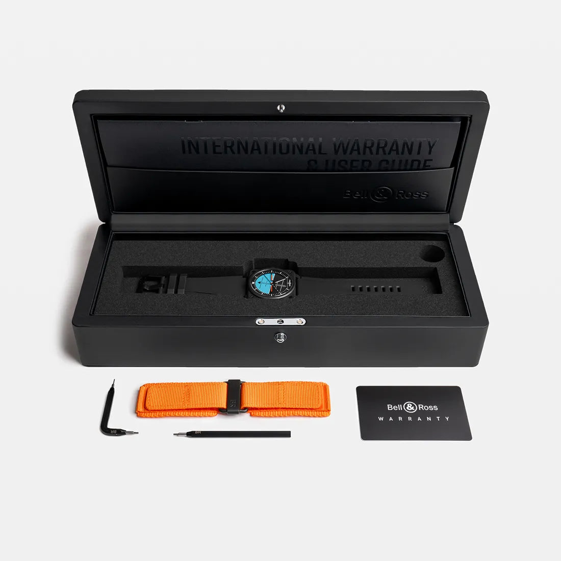 ビーズブラスト ブラック セラミック。 文字盤: ブルーとブラックのディスクに表示される時間。ホワイトの分針。ブラック/ホワイト ストライプの秒針。水平線を表示するレッド デカール。 カバーガラス: 反射防止サファイアクリスタル ストラップ: ブラック ラバーおよびオレンジ合成ファブリック。 バックル: ピン。マットブラック PVD(物理蒸着)コーティング ビーズブラスト ステンレススティール。 |