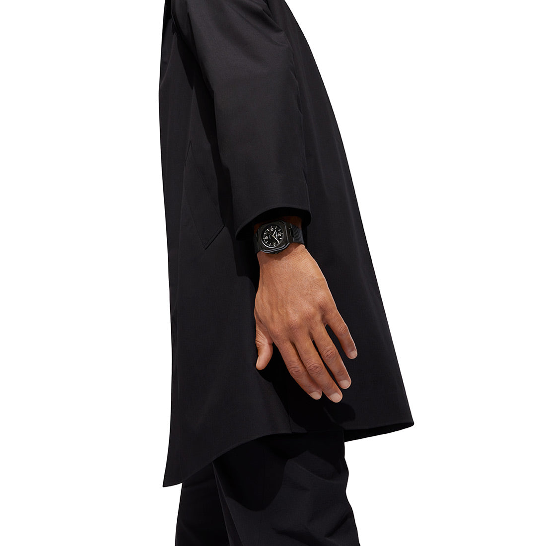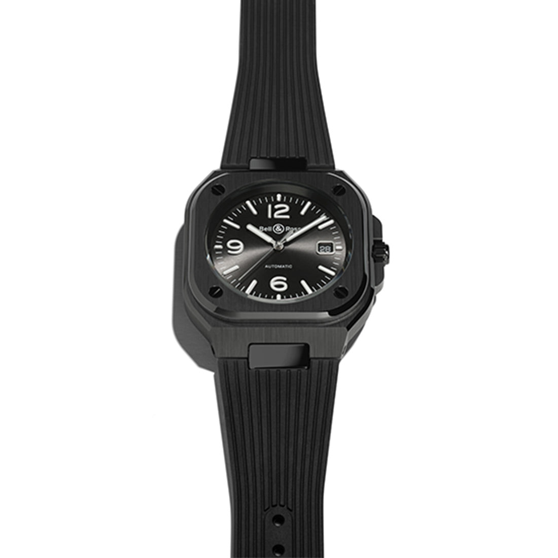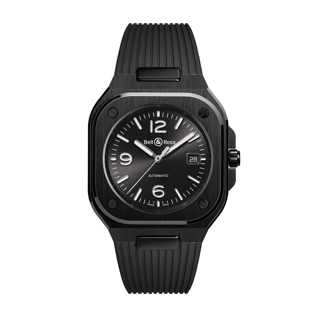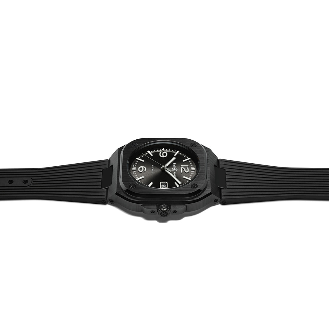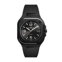 ポリッシュ・サテン仕上げの3新モデルBR 05 ブラック セラミックは、光沢のあるブラックのサンバースト文字盤に、ホワイトの夜光塗料が施されたロジウムメッキのスケルトン針を備え、セラミック ブレスレットまたはラバー ストラップからお選びいただけます。