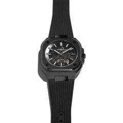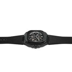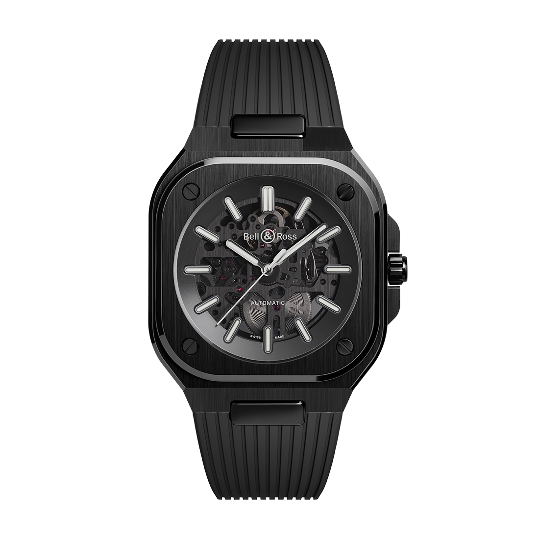 サテンポリッシュ仕上げのBR 05 スケルトン ブラック セラミックは、シースルーの文字盤からブラック・ルテニウム仕上げの機械式自動巻きムーブメントBR-CAL.322が見えます。