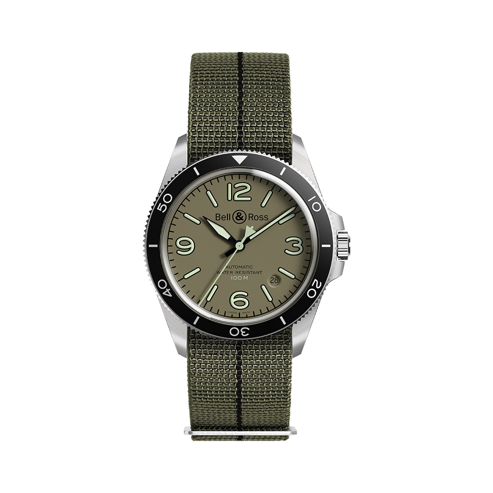 サテン / ポリッシュ仕上げステンレススティール ベゼル: 陽極酸化処理ブラック アルミニウム リング付きステンレススティール製 60 分目盛り付き両方向回転式ベゼル 文字盤: ブラック ホワイトのスーパールミノバ® 加工を施した数字およびインデックス スーパールミノバ® をコーティングしたスケルトン メタルの時針および分針 ストラップ: カーキとブラックのエラスティック キャンバス |