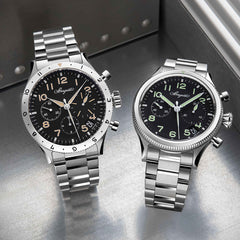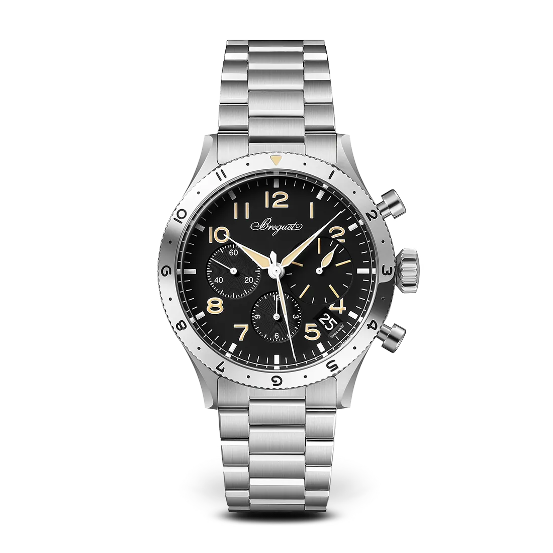 タイプ XX、ステンレススティール、フライバック・クロノグラフ、自動巻、スモールセコンド、日付カレンダー、シリコン製ひげゼンマイ、15分計、12時間計、目盛り付き両方向回転ベゼル、蓄光針とアワーマーカー、サファイア・ケースバック(透明裏蓋)、10気圧防水(100m)。