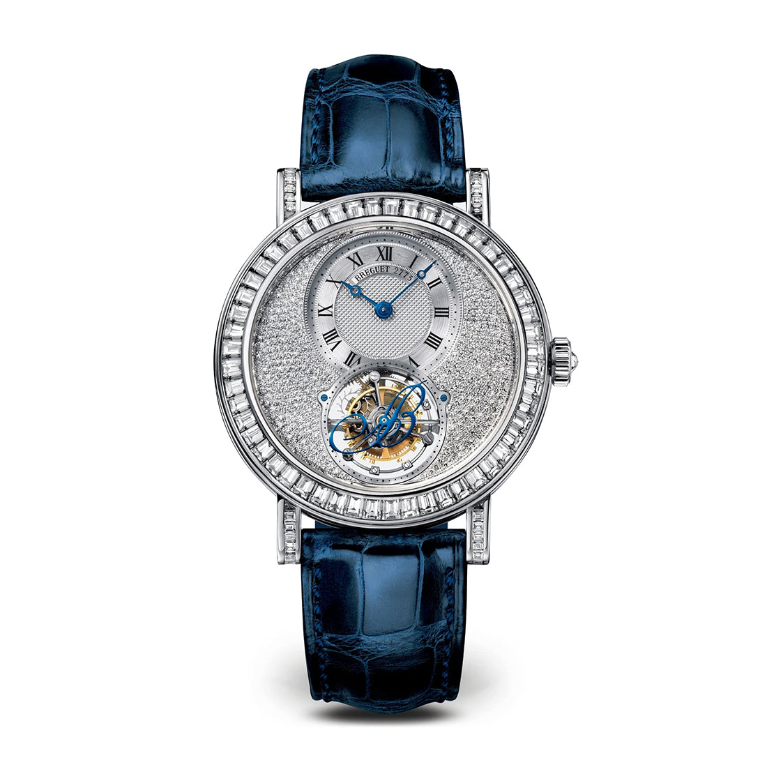 (手彫りギヨシェ模様)に ダイヤモンド356個(約0.50カラット)、 ベゼルとラグとケースサイドに バゲットダイヤモンド134個 (約10.37カラット)、 ケース径40.30 mm