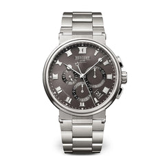 マリーン・クロノグラフ。自動巻、日付カレンダー、スモールセコンド。30分計、12時間計。ひげゼンマイにシリコン素材。サファイア・ケースバック(透明裏蓋)。ねじ込み式リュウズ。10気圧(100m)防水。