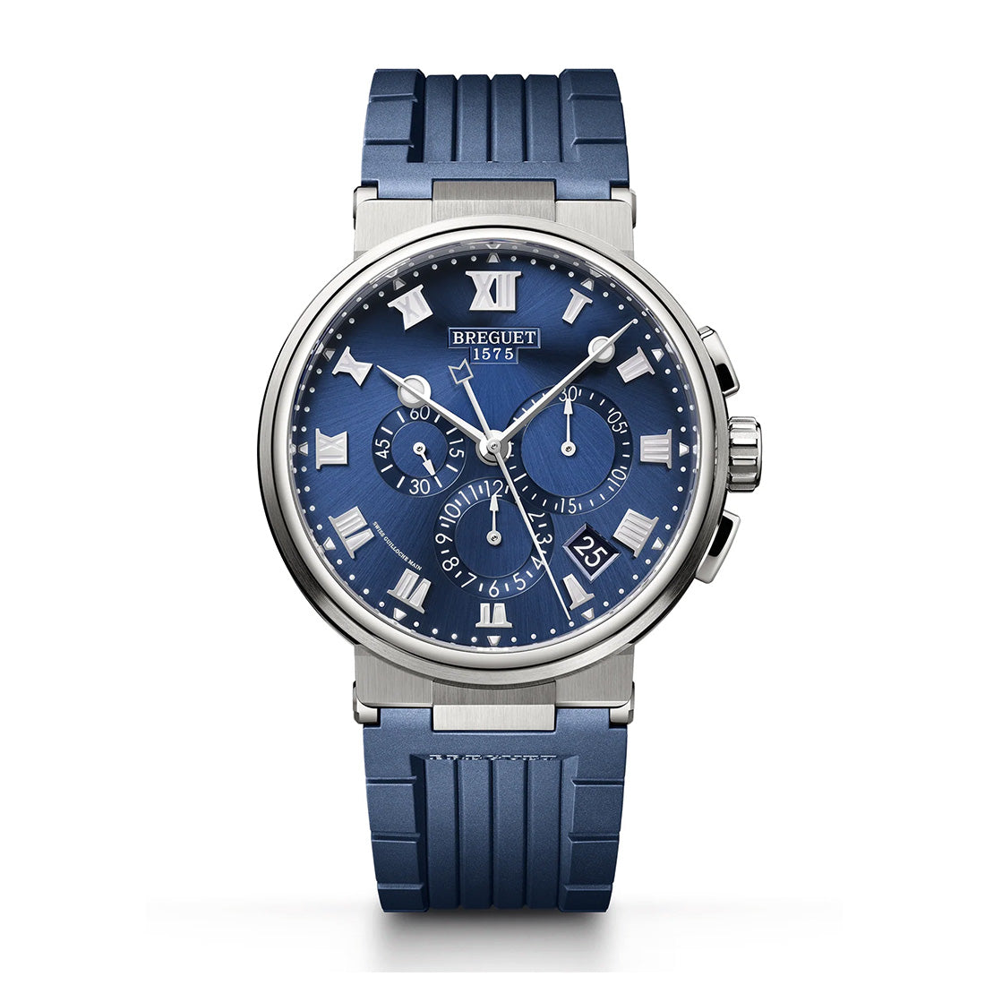 マリーン・クロノグラフ。自動巻、日付カレンダー、スモールセコンド。30分計、12時間計。ひげゼンマイにシリコン素材。サファイア・ケースバック(透明裏蓋)。ねじ込み式リュウズ。10気圧(100m)防水。