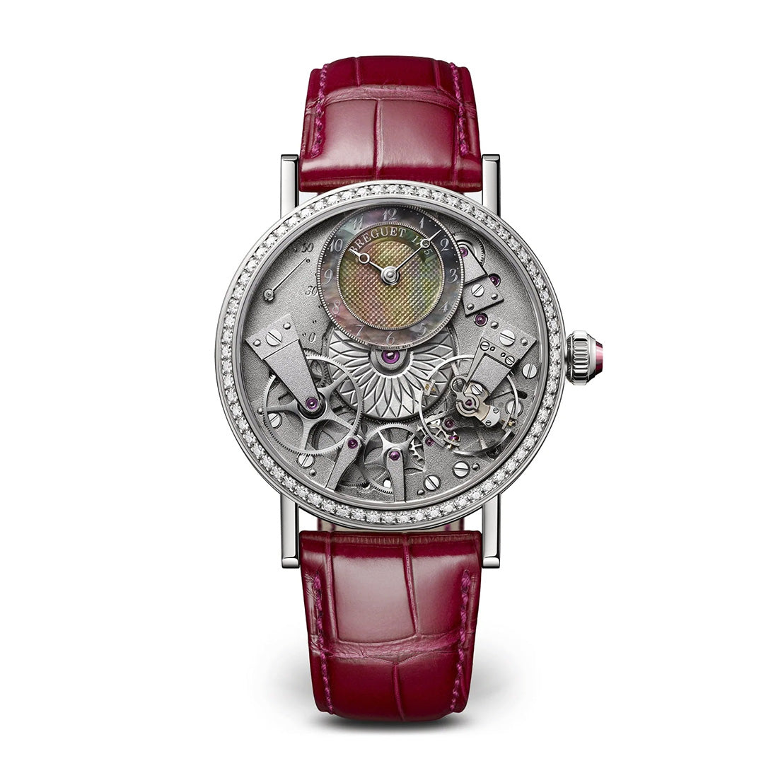 Dial ナチュラルマザーオブパールダイヤル、手彫りギヨシェ模様、12時位置にオフセット。個別番号とBreguetのサイン。アラビア数字のチャプターリング。ゴールドのブレゲ針。