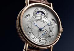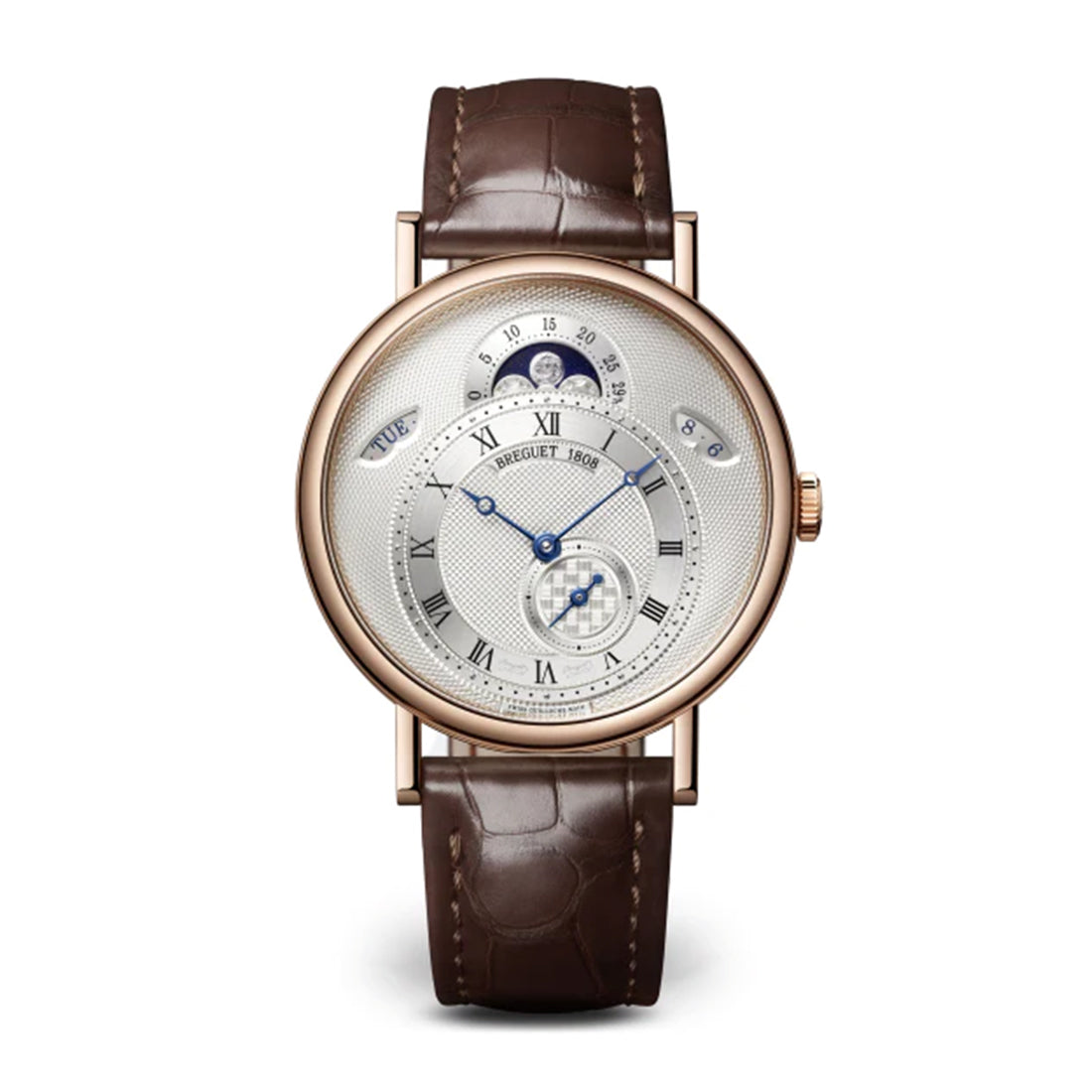 文字盤l: ブルー仕上げ 18K ゴールド、手彫りギヨシェ模様。個別番号とBreguetのサイン。6時位置にオフセットされたローマ数字のチャプターリング。ブレゲ針。12時位置にムーンフェイズと月齢表示。2時位置に日付表示。10時位置に曜日表示。5時位置にスモールセコンド。