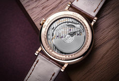 ケース: 18K ローズゴールド、ケースバンドに繊細なフルート装飾。ケースにロウ付けされたラグとネジ留め式バー。ケース径 39mm、厚さ 9.9mm。サファイア・ケースバック(透明裏蓋)。3気圧(30m)防水。