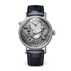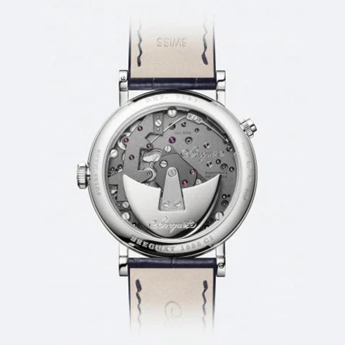 トラディション、18Kホワイトゴールド、レトログレイド式日付表示。グレイ仕上げの自動巻ムーブメント。シリコン製ブレゲひげゼンマイ。オフセンターに配置されたシルバー仕上げゴールドダイヤル、手彫りギヨシェ模様。サファイア・ケースバック(透明裏蓋)。3気圧(30 m)防水。ケース径:40 mm。アリゲーターストラップにゴールドのピンバックル。