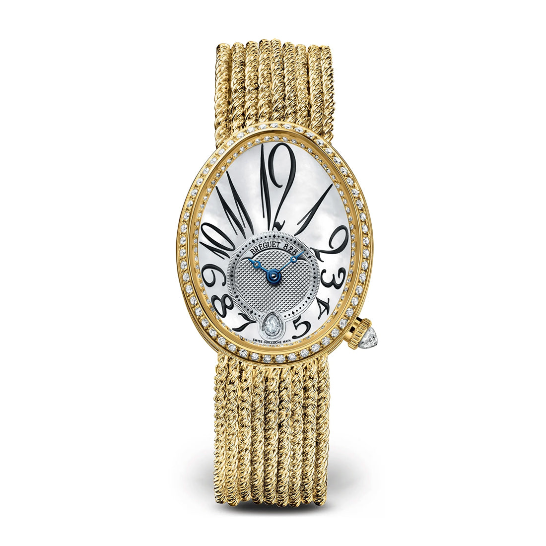 レーヌ・ドゥ・ナープル、18Kゴールド。ベゼルとダイヤルのフランジにダイヤモンド117個(約0.99カラット)。自動巻。ひげゼンマイとガンギ車にシリコン素材。サファイア・ケースバック(透明裏蓋)。3気圧(30m)防水。