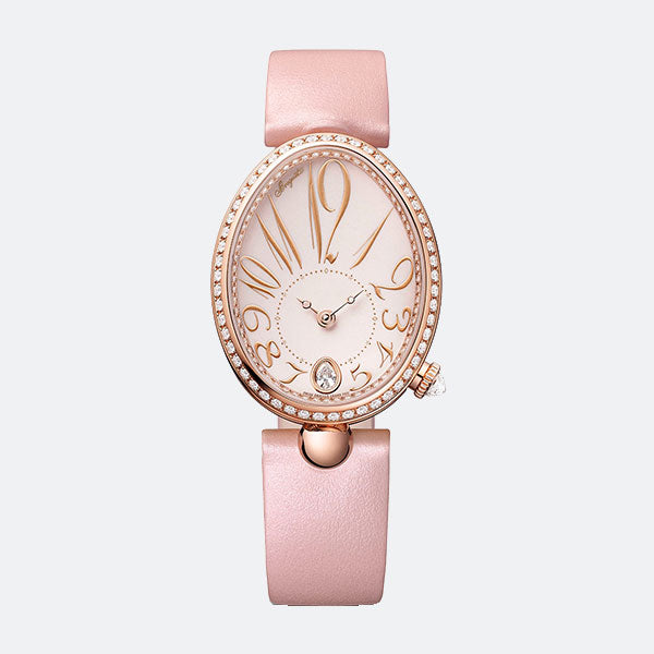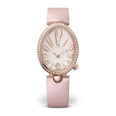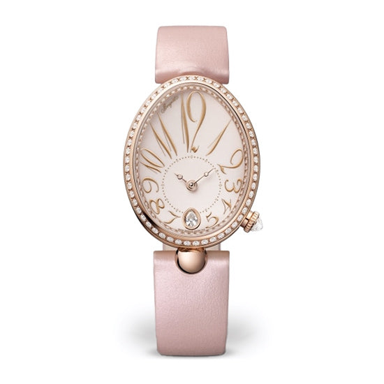 レーヌ・ドゥ・ナープル、18Kゴールド。ベゼルとダイヤルのフランジとリューズにダイヤモンド118個(約0.94カラット)。オフセンター・チャプターリング、ブレゲ数字、自動巻、ひげゼンマイとガンギ車にシリコン素材。サファイア・ケースバック(透明裏蓋)、3気圧防水(30m)、ケース径36.5 x 28.45mm