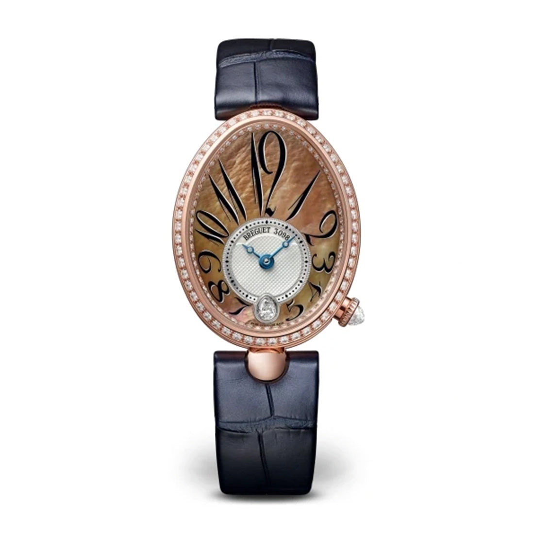 レーヌ・ドゥ・ナープル、18Kゴールド。ベゼルとダイヤルのフランジにダイヤモンド117個(約0.99カラット)。自動巻。ひげゼンマイとガンギ車にシリコン素材。サファイア・ケースバック(透明裏蓋)。3気圧(30m)防水。