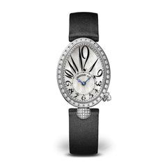 Case 18Kホワイトゴールド、湾曲したオーバル形、ケースバンドに繊細なフルート装飾。べゼル、フランジとラグにブリリアントダイヤモンド139個(約1.255カラット)、リュウズにブリオレッテカットダイヤモンド(約0.26カラット)。サファイア・ケースバック(透明裏蓋)。ケース径33×24.95mm。3気圧(30m)防水。