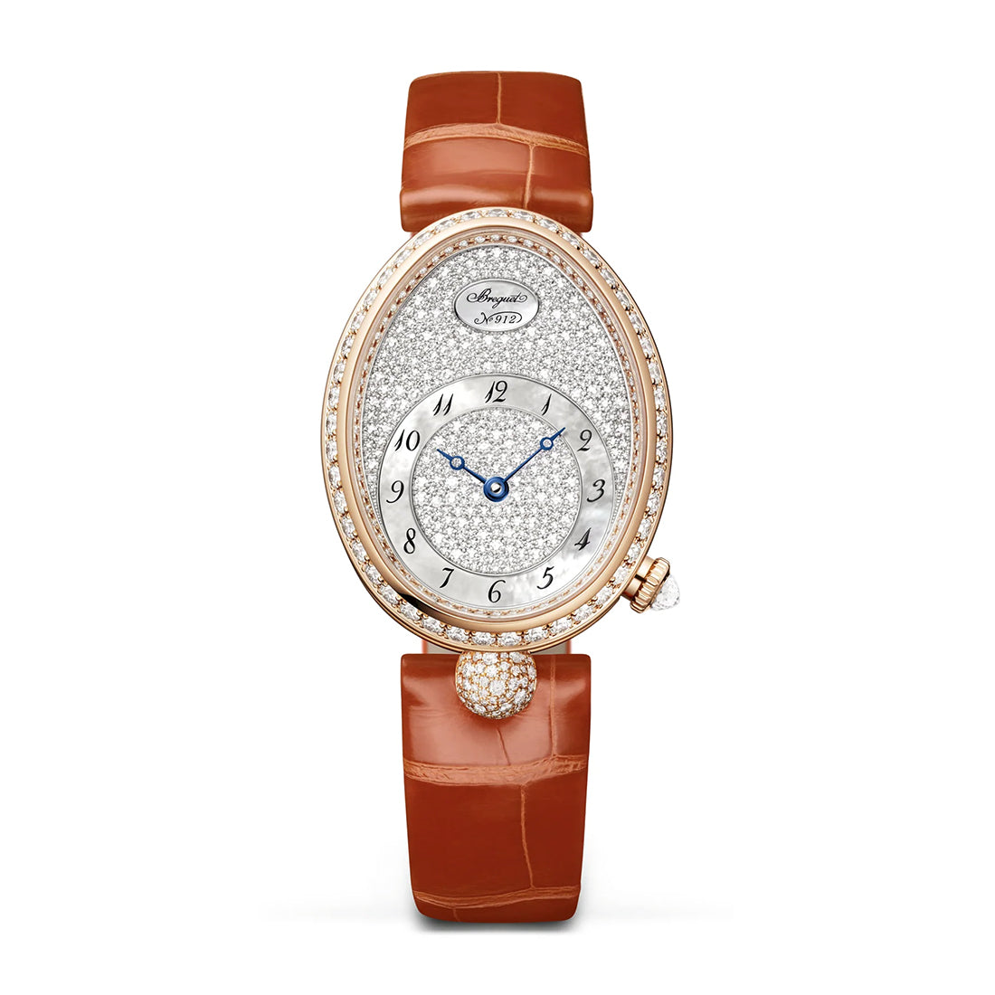ゴールド、スノーセッティングのダイヤモンド 384 個(約 0.89 カラット)。個別番号と Breguet のサイン。6時位置にオフセットされたホワイトマザーオブパールのチャプターリング、ブレゲ数字。ブルー・スティールのブレゲ針。