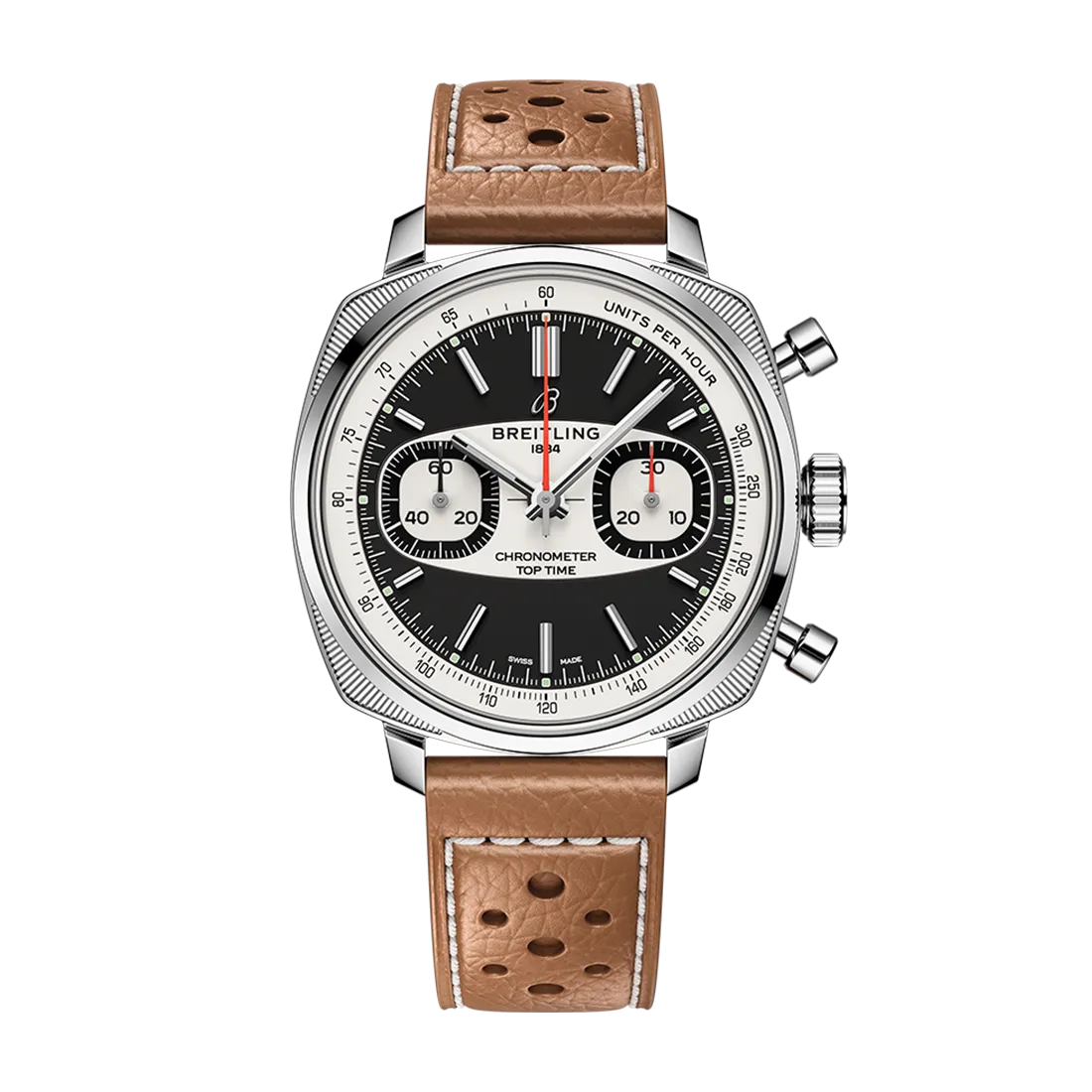 トップタイムレーシングは、1960年代の最も印象的なトップタイムデザインの血統を受け継ぐモデルです。クッション型ケース、視認性の高いタキメータースケール、特徴的な「スクワークル(四角と丸が融合した形)」のサブダイヤルが、レースコースのハイスピードとコンマ数秒の決断を彷彿とさせます。ダイヤルの中心には、クラシックカーのダッシュボードにインスパイアされた楕円形の「サーフボード」モチーフがあしらわれ、トップタイムのアーカイブから受け継がれたアイコニックなデザインが息づいています。