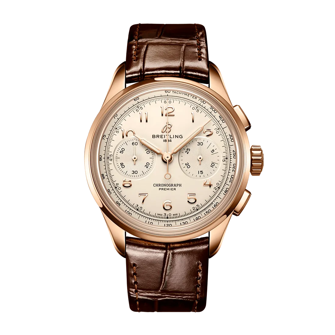 レオン、ガストン、ウィリー・ブライトリングという3世代の発明家へのオマージュを込めたプレミエ クロノグラフは、近代のクロノグラフラフを発明したブライトリングのレガシーを体現したものです。ウィリー・ブライトリングが語ったように、プレミエは「非の打ちどころのないセンス」を呈しています。 この最新世代のプレミエ クロノグラフでは、タイムレスなエレガンスを蘇らせました。クロノグラフ、デュオグラフ、ダトラはプレミエの象徴的なコンプリケーション機構を搭載し、ブライトリングの時計製造技術が最高レベルであることを示しています。 長方形のクロノグラフプッシャー、バイコンパックス・クロノグラフ、アラビア数字の特徴に加え、ケースサイドの溝、サファイアのオープンケースバック、ヴィンテージ風の針など、エレガントなデザインディテールが様々に施された、伝統を受け継いだプレミエ クロノグラフです。 このクロノグラフは、ステンレススチール製でピスタチオグリーンのダイヤルとゴールドブラウンのアリゲーターストラップ、そして18Kレッドゴールド製でシルバーのダイヤルとブラウンのアリゲーターストラップの2種類をご用意しました。 クロノグラフは、手巻き式のCOSC認証を受けたブライトリングマニュファクチュールキャリバーB09で駆動します。