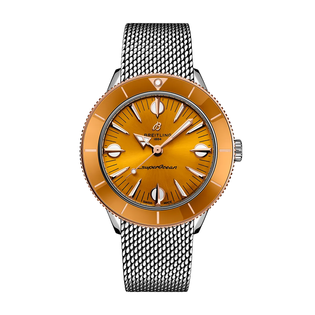 直径38mm 、ベージュ、グリーン、マスタード、ブルーの鮮やかなアースカラーの文字盤が特徴です。初代ヴィンテージ・スーパーオーシャンと同様に凹型をしたセラミック製ベゼル、特大のインデックス、矢型の時針など、 1957 年のオリジナルから受け継いだデザイン要素をいくつも備えています。