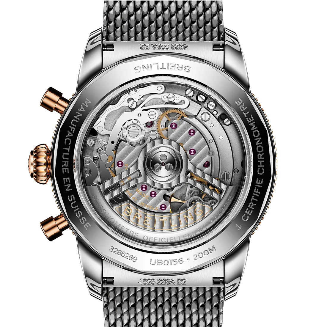 クロノグラフのコレクションには、ブライトリングによる業界屈指の高精度ムーブメント「ブライトリングマニュファクチュールキャリバー01」を搭載。ダイヤルと同系色のセラミックを象嵌したベゼルにより、優れた耐傷性能が実現され、新品のような美しさを長く保つことができます。より薄型でケースに一体化したメッシュのメタルブレスレットおよびメッシュ風ラバーストラップは、防水性の高いフィット感を実現。フォールディングクラスプを備え、シームレスな仕上がりとなっています。