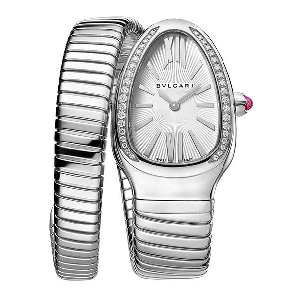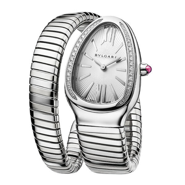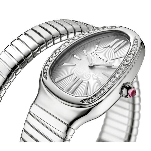 ブリリアントカット・ダイヤモンドをあしらった35 mmのステンレススティール製カーブケース カボションカットのピンク・ルベライトをあしらったステンレススティール製リューズ ダイヤル: ギョーシェ・ソレイユ仕上げを施したシルバーのオパラインダイアル ブレスレット: ハンドアプライド インデックス。ステンレススティール製シングルスパイラルブレスレット |