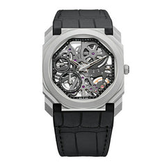 40mmの極薄チタニウム製ケース(厚さ5.37mm)、シースルーケースバック。セラミックをあしらったチタニウム製リューズ。 ダイアル: シースルーダイアル ストラップ: チタニウム製アーディヨンバックルの付いたアリゲーター製ストラップ |
