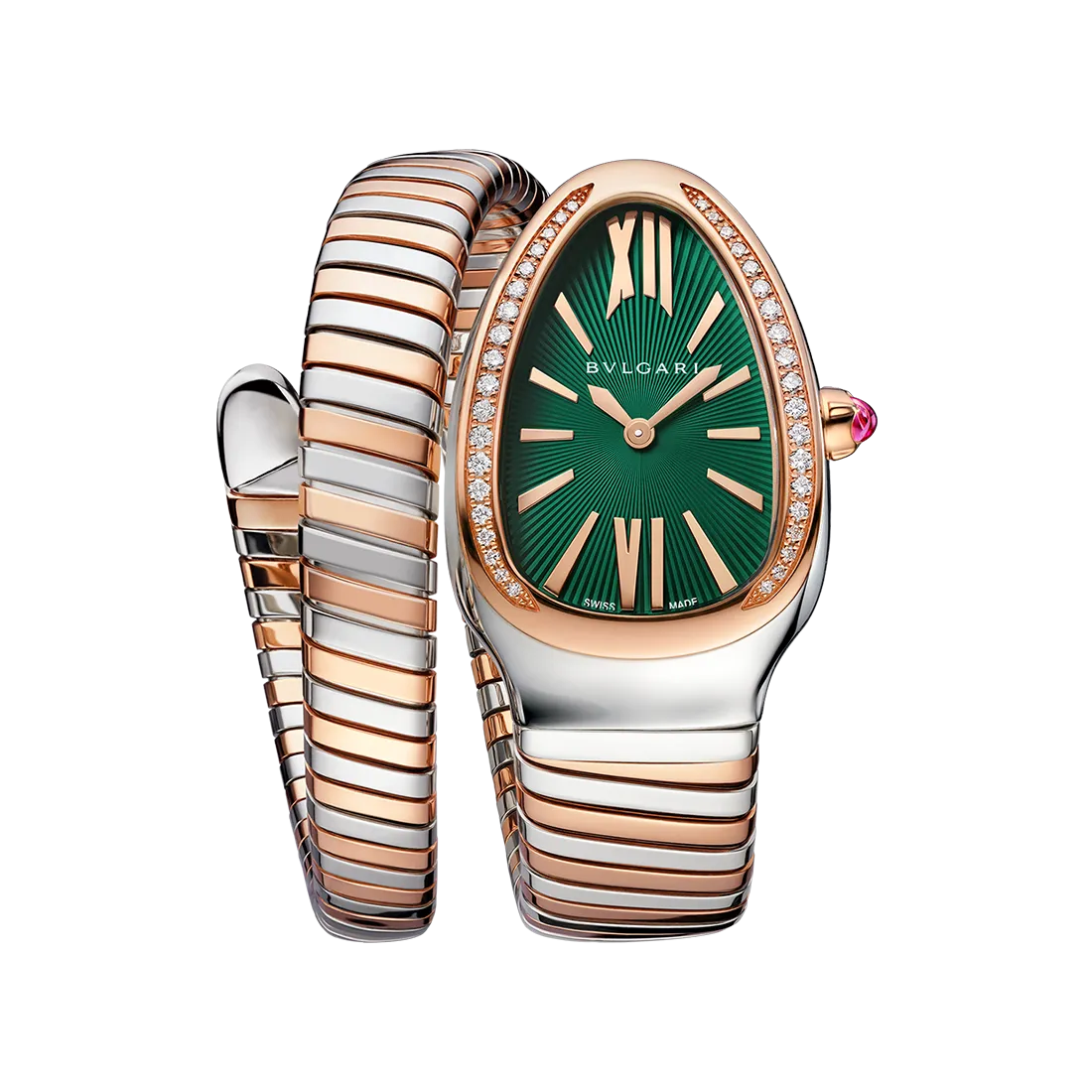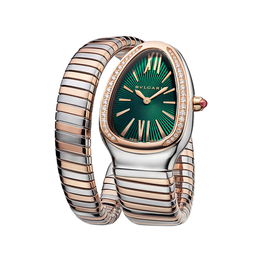 38個のラウンドブリリアントカットダイヤモンド(0.3ct)をあしらったスティール製 35㎜ケースとローズゴールド製ベゼル カボションカットピンクルベライトをあしらったピンクゴールド製クラウン ダイヤル: ギヨシェ彫りサンバースト加工をしたグリーンダイヤル ローズゴールドプレート針とインデックス ブレスレット: 1連/2連のスティール・ローズゴールド製ブレスレット 1連サイズ:135㎜ 2連サイズ:145㎜ |