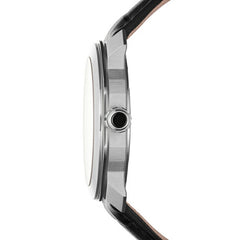 ステンレススティール製ケースにシースルーケースバック ダイアル: チャコールグレーのダイアル。ハンドアプライド インデックス。 ストラップ: ブラックのアリゲーター製ストラップ ステンレススティール製フォールディング・バックル |