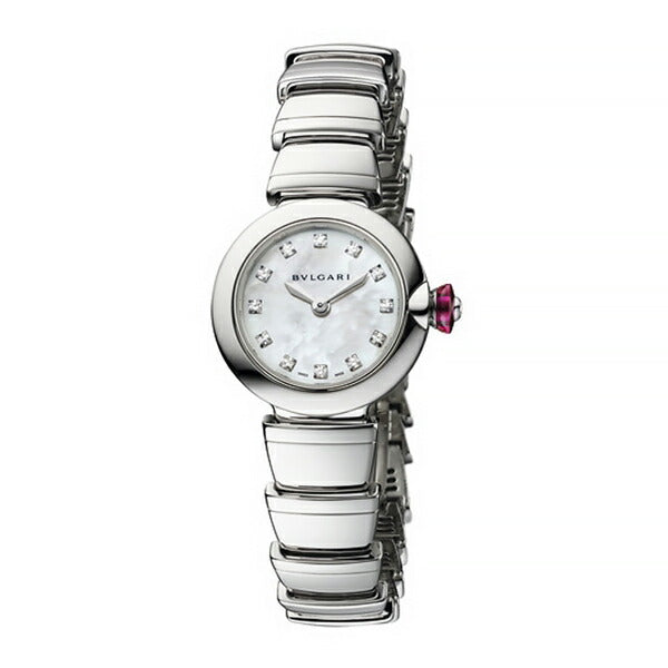 ステンレススティール製ケース ステンレススティール製リューズにカボションカットのピンクストーンとダイヤモンドをセッティング ダイヤル: ホワイトマザー・オブ・パールのダイアルにダイヤモンドインデックスをセッティング ブレスレット: ステンレススティール製ブレスレット |