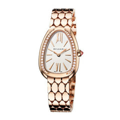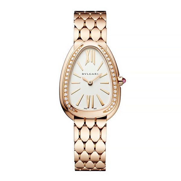 時を超えてモダンなブラックのエレガンスが漂うステンレススティール製セルペンティ セドゥットーリ ウォッチ。ブラックDLC(ダイヤモンドライクカーボン)仕上げが、抗いがたいミステリアスな官能性とコンテンポラリーな魅力を見事にブレンドしています。 特徴的なドロップ型のウォッチは、ブリリアントカットのダイヤモンドをセットした18Kピンクゴールド製の艶やかなベゼルが、ブラックラッカー仕上げのダイアルと魅惑のコントラストを演出しています。 ヘキサゴンのウロコのモチーフを再現したしなやかさが官能的なブレスレットが、ジュエリーとウォッチメイキングの世界を完璧につないでいます。