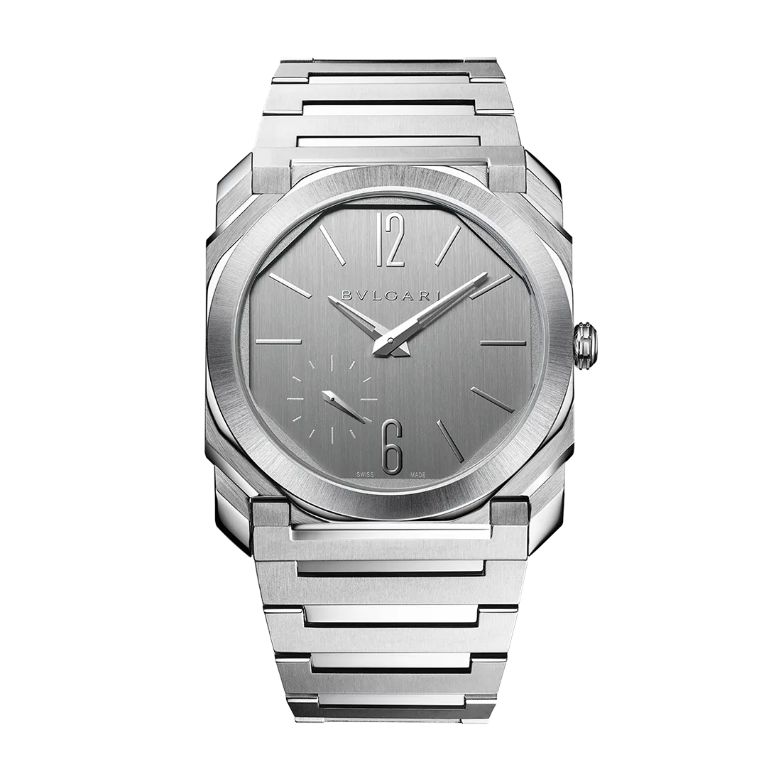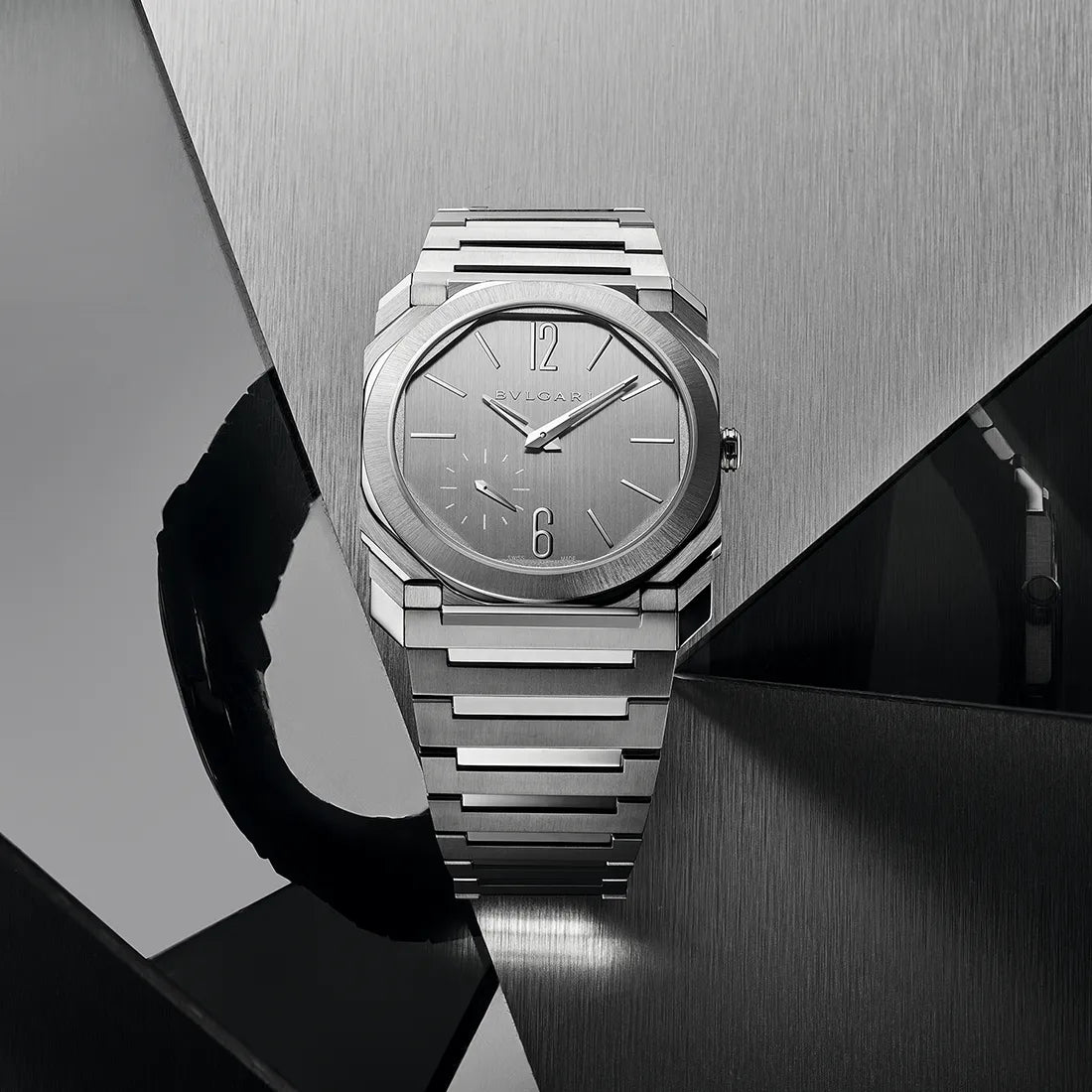 オクト フィニッシモ S ウォッチ。機械式マニュファクチュールムーブメント、自動巻き、プラチナ製マイクロローター、時・分・スモールセコンド表示、コート・ド・ジュネーブ装飾を施したBVL138 フィニッシモ キャリバー(厚さ2.23mm)、面取り仕上げのブリッジ、サーキュラーグレイン仕上げのベースプレート、60時間パワーリザーブ、振動数21,600 VpH。 直径40mmの極薄サテンポリッシュ仕上げステンレススティール製ケース(厚さ6.40 mm)、シースルーケースバック、セラミックをあしらったポリッシュ仕上げのステンレススティール製スクリューダウンリューズ、バーティカルブラッシュ仕上げのシルバーダイアル。バーティカルブラッシュ仕上げのステンレススティール製ブレスレット 、ポリッシュ仕上げのパーツとフォールディングクラスプ付き。 100メートル防水。
