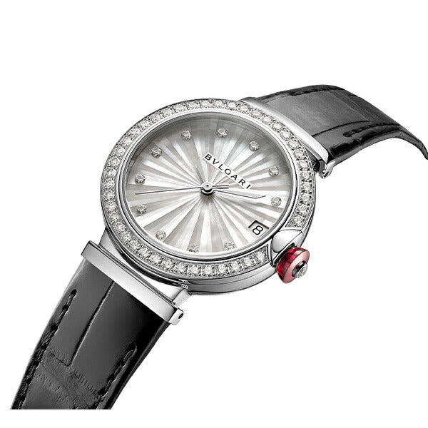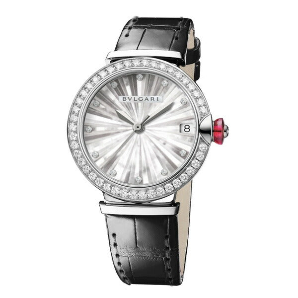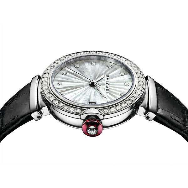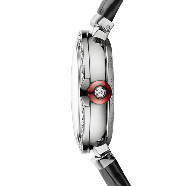 28mmのポリッシュドステンレススティール製ケース(厚さ10.07mm) ステンレススティール製ベゼルにダイヤモンドをセッティング / ステンレススティール製リューズにカボションカットのシンセティックルベライトをセッティング ダイヤル: ホワイトのマザー・オブ・パール製インタルシオマルケトリダイアル / 11個のラウンドカット・ダイヤモンドを配したインデックス ブレスレット: ブラックのアリゲーター製ストラップ / ステンレススティール製アーディヨンバックル |