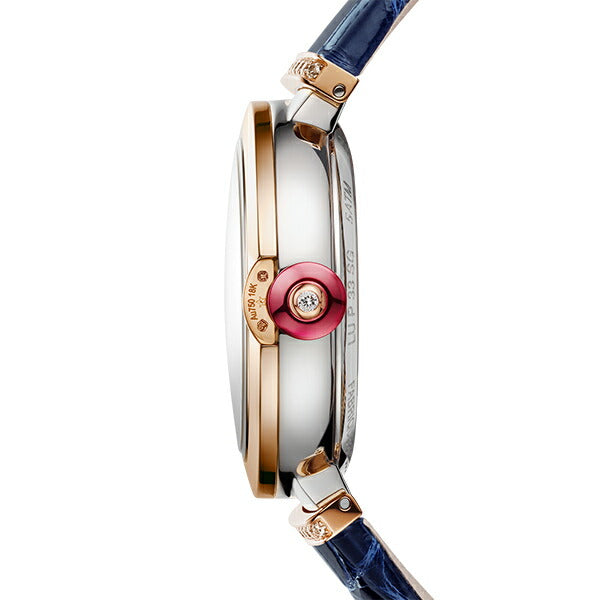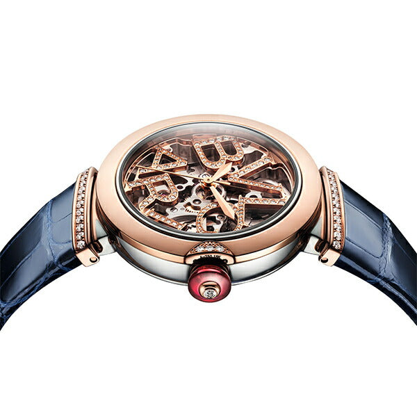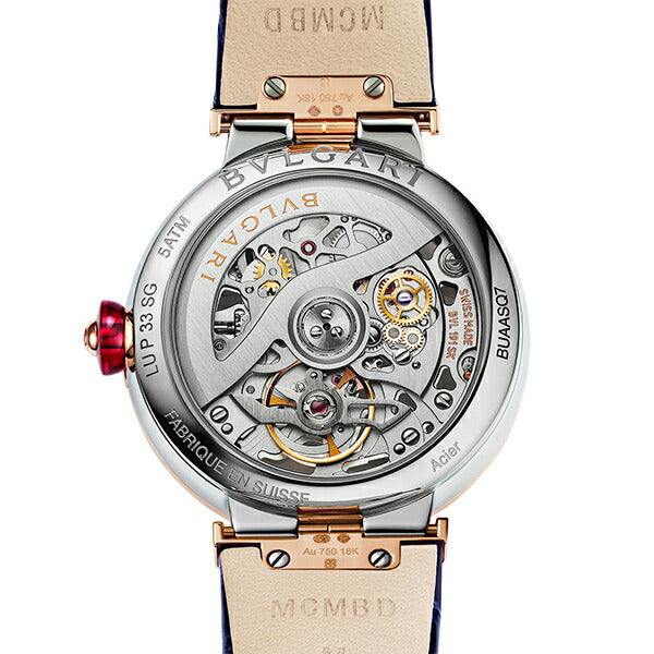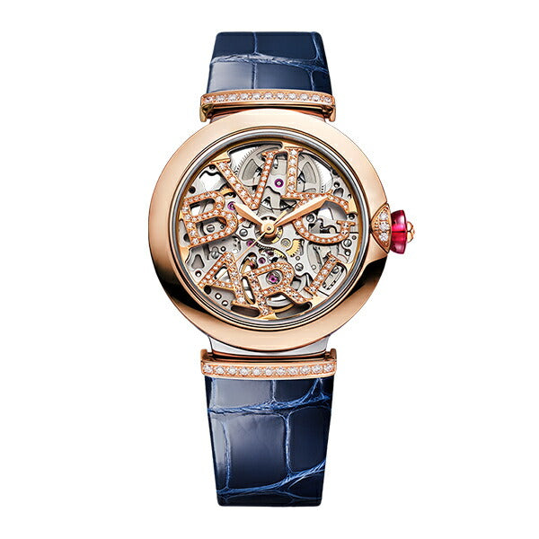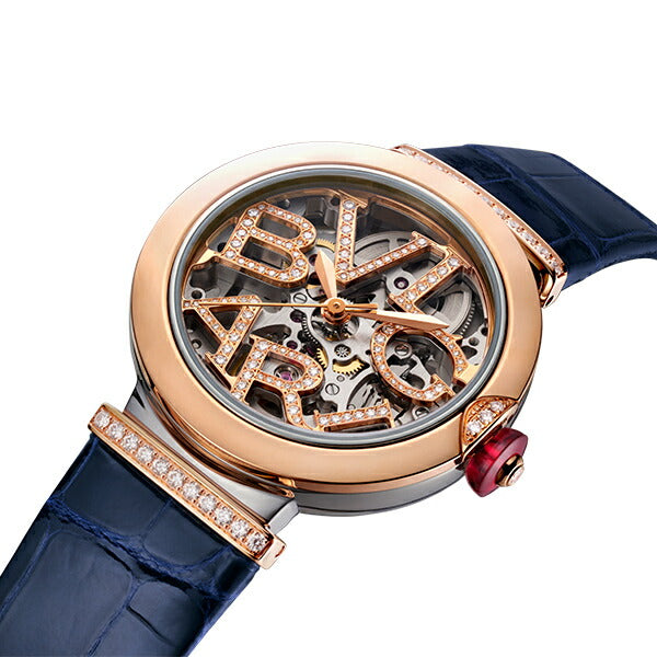 33mmのステンレススティール製ケース 18Kピンクゴールド製ベゼル / 18Kピンクゴールド製リューズにカボションカットのシンセティック ルベライトとダイヤモンドをセッティング ダイヤル: ブリリアントカット・ダイヤモンドをあしらったブルガリロゴの18Kピンクゴールド製オープンワークダイアル ブレスレット: ブルーのアリゲーター製ストラップにダイヤモンドをあしらった18Kピンクゴールド製リンク / ステンレススティール製アーディヨンバックル |