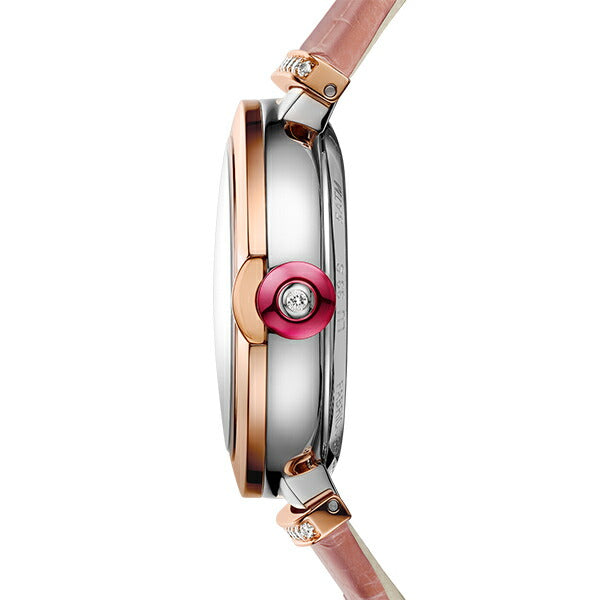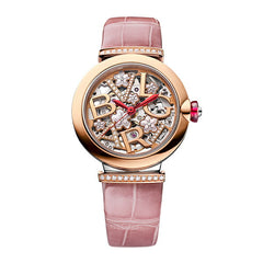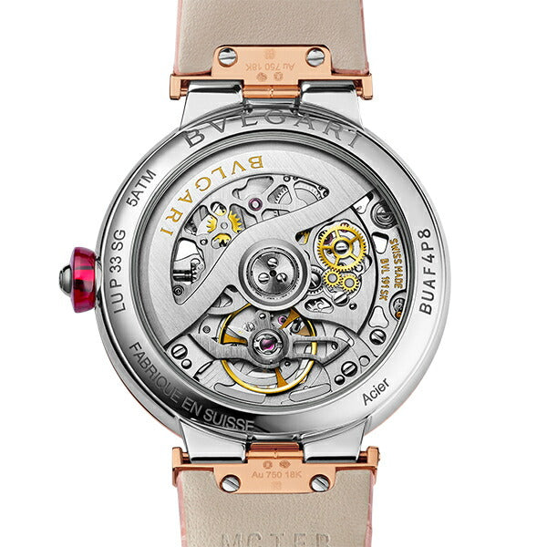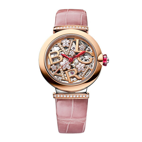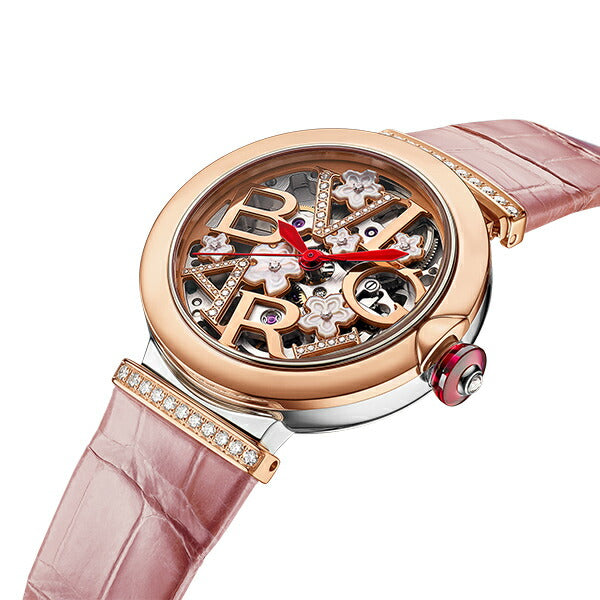 33mmのステンレススティール製ケース 18Kピンクゴールド製ベゼル / 18Kピンクゴールド製リューズにカボションカットのシンセティック ルベライトとダイヤモンドをセッティング ダイヤル: マザー・オブ・パールの花とブリリアントカット・ダイヤモンドをあしらったブルガリロゴの18Kピンクゴールド製オープンワーク ダイアル / レッドの針 ブレスレット: ライトピンクのアリゲーター製ストラップ、ダイヤモンドをあしらった18Kピンクゴールド製リンク、ステンレススティール製アーディヨンバックル |