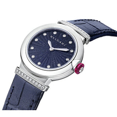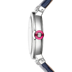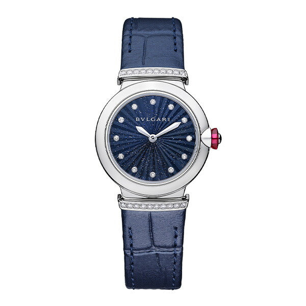 28mmのステンレススティール製ケース ラウンドブリリアントカット・ダイヤモンドをあしらったステンレススティール製リンク / ステンレススティール製リューズにカボションカットのシンセティック ルベライトとラウンドカット・ ダイヤモンド1個 ダイヤル: ブルーアベンチュリンのマルケトリダイアル / 12個のラウンドブリリアントカット・ダイヤモンドを配したインデックス ブレスレット: ブルーのアリゲーター製ストラップ / ステンレススティール製アーディヨンバックル |