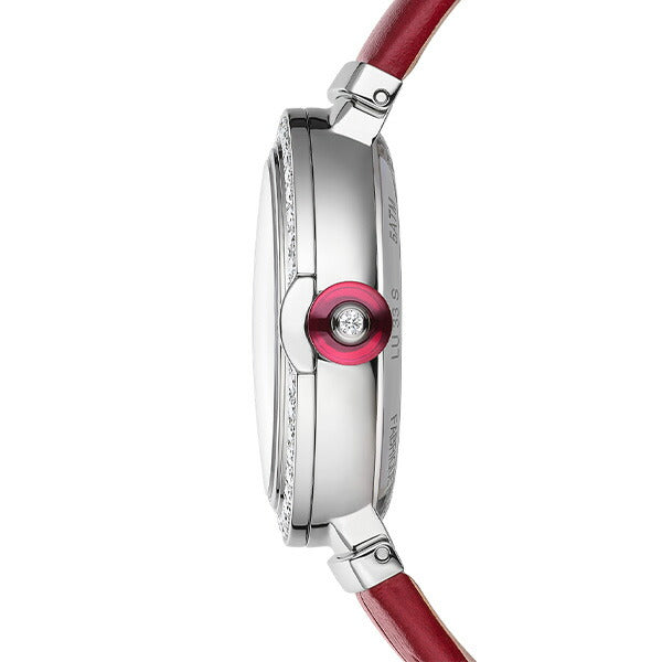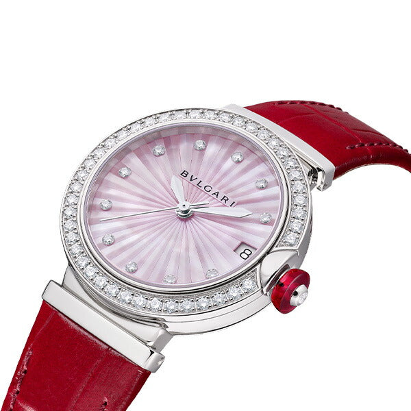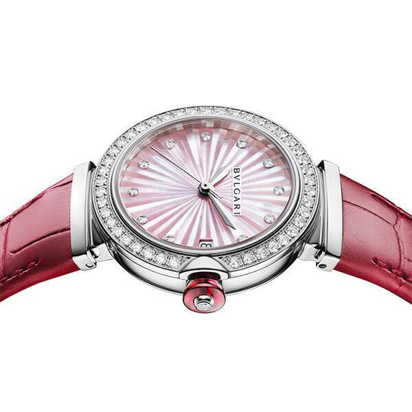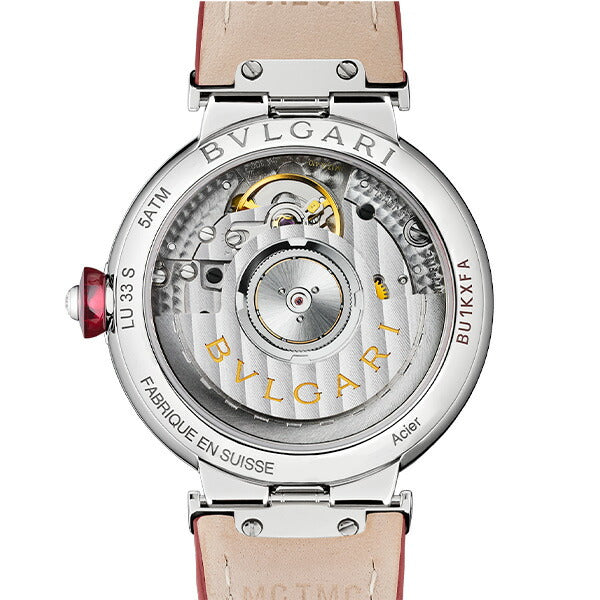 33mmのステンレススティール製ケース ステンレススティール製ベゼルにラウンドブリリアントカット・ダイヤモンドをセッティング / ステンレススティール製リューズにカボションカットのシンセティック ルベライト(約0.816カラット)とラウンドカットダイヤモンドをセッティング ダイヤル: ピンクのマザー・オブ・パール製マルケトリダイアル / 11個のラウンドカットダイヤモンドを埋め込んだインデックス ブレスレット: ピンクのアリゲーター製ストラップ / ステンレススティール製アーディヨンバックル |