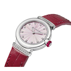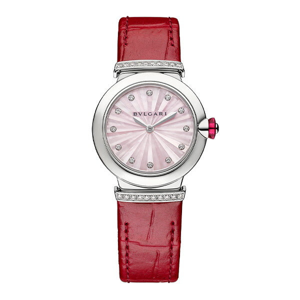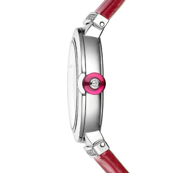 28mmのステンレススティール製ケース ラウンドブリリアントカット・ダイヤモンドをあしらったステンレススティール製リンク / ステンレススティール製リューズにカボションカットのシンセティック ルベライトとラウンドカット・ ダイヤモンド1個 ダイヤル: ピンクのマザー・オブ・パールのマルケトリダイアル / 12個のラウンドブリリアントカット・ダイヤモンドを配したインデックス ブレスレット: ピンクのアリゲーター製ストラップ / ステンレススティール製アーディヨンバックル |
