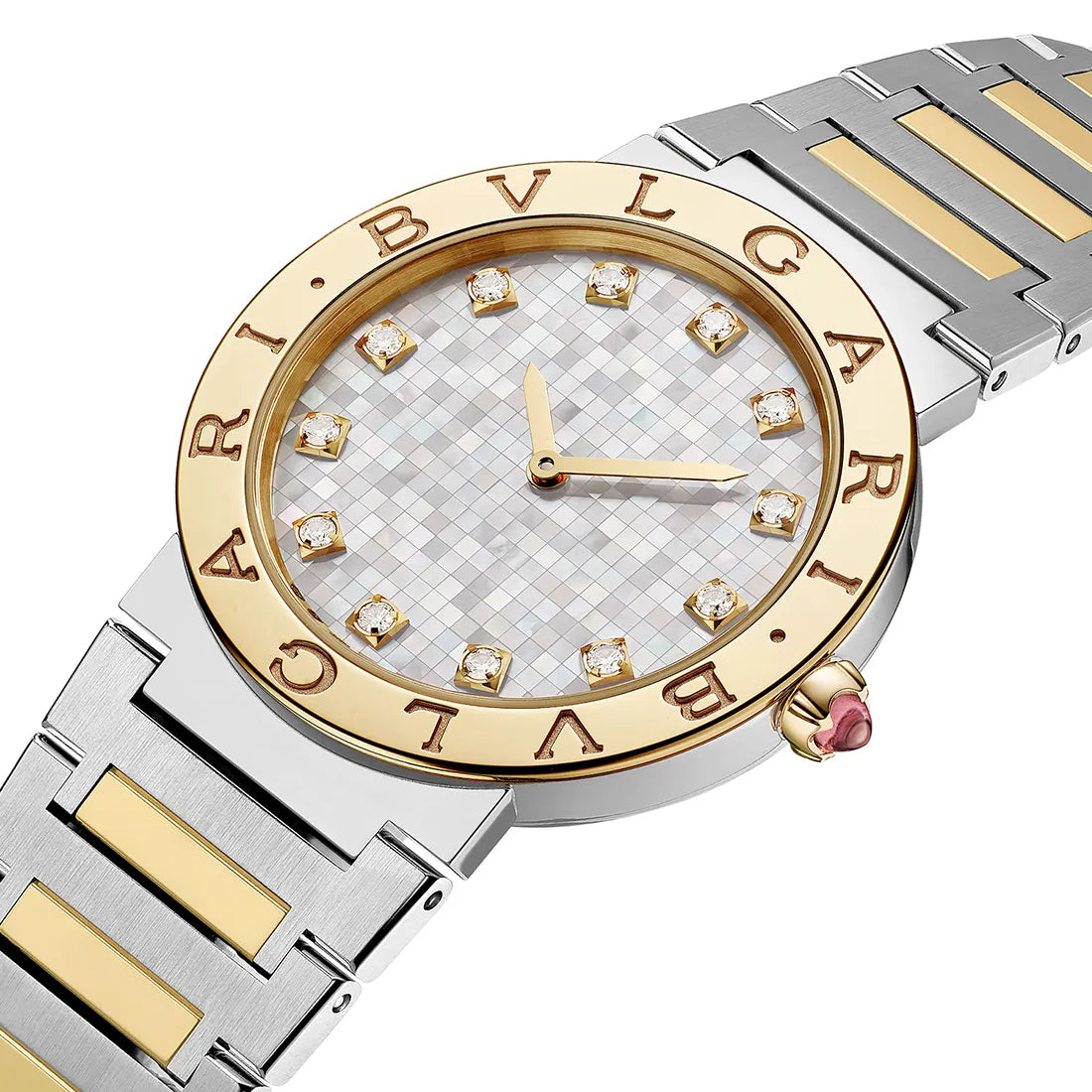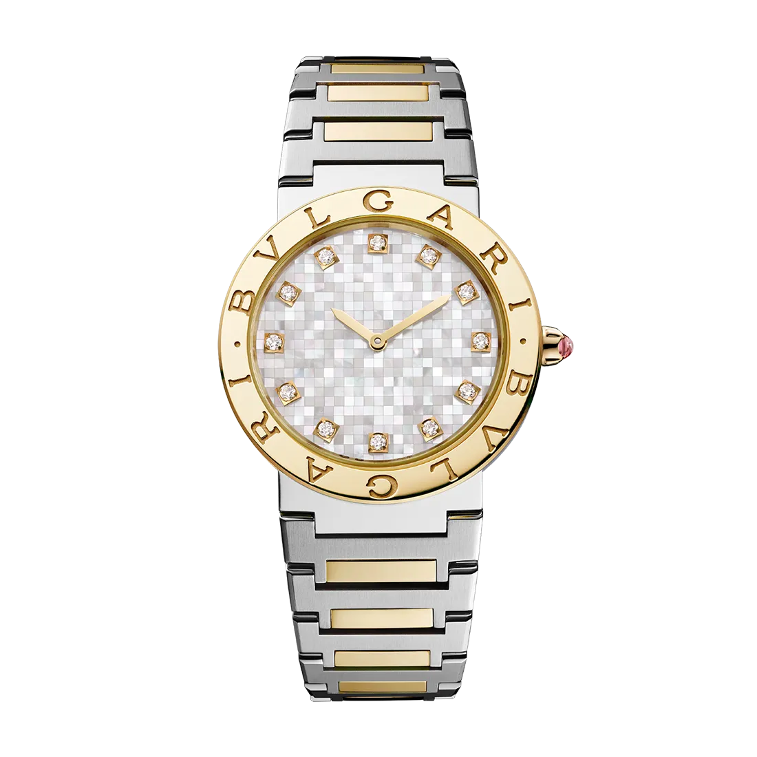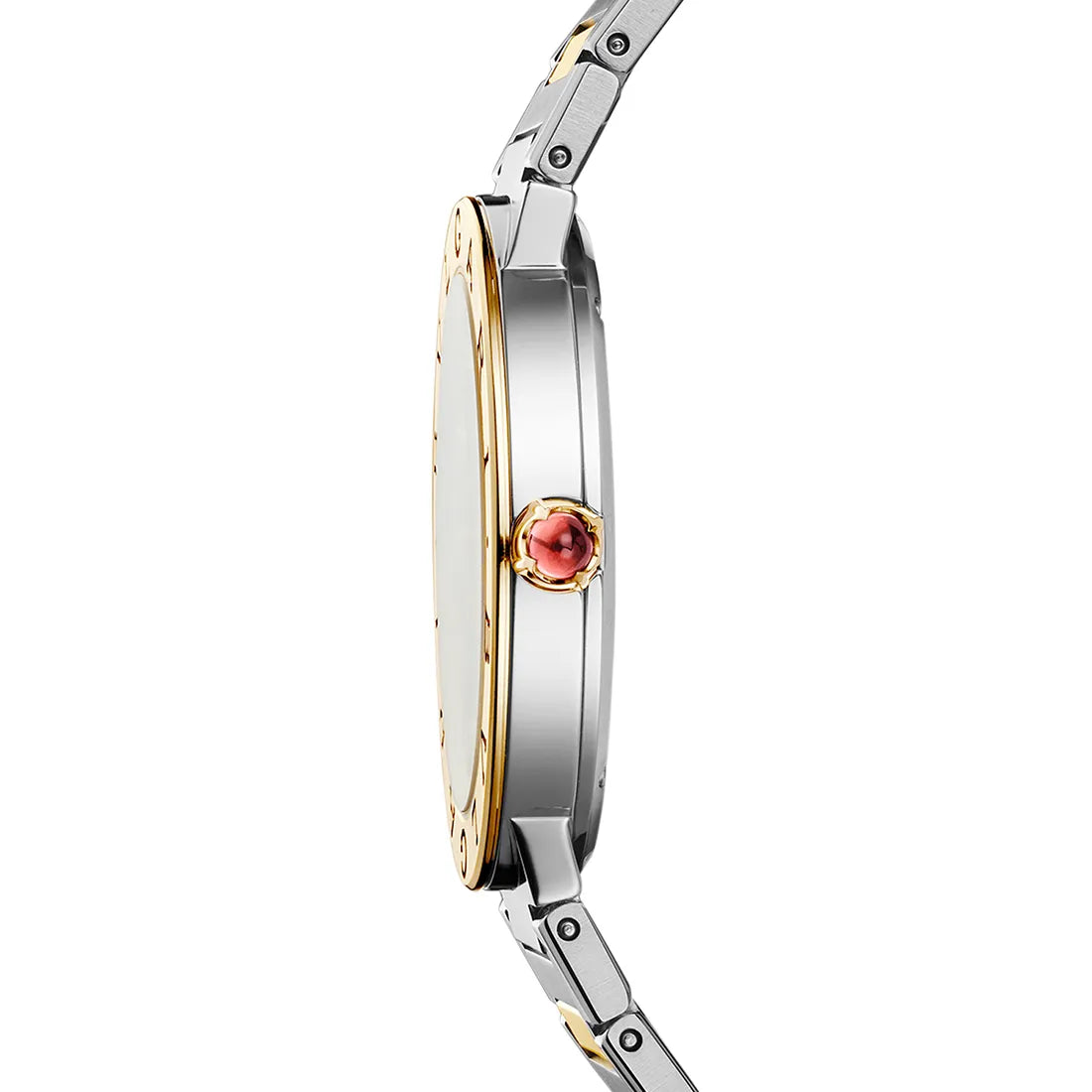 33mmスチールとイエローゴールド製ケースとダブルロゴが刻まれたベゼル カボションカットの天然ピンクルベライトをあしらったイエローゴールド製のクラウン ダイアル: 約400個のピースで構成されたホワイトマザーオブパールのモザイクダイヤル 12個のダイヤモンドインデックス(~0.21ct / ~0.12ct) ブレスレット: ポリッシュ仕上げとサテン仕上げのスチールとイエローゴールド製のブレスレットに フォールディングバックル |