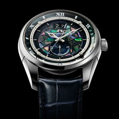 ダイヤル:漆塗り文字板(電気鋳造+漆塗り+螺鈿) スクリュー式シースルーバックサファイアガラス(無反射コーティング) ガラス:デュアル球面サファイアガラス (クラリティ・コーティング) バンド:ワニ革 / 三ツ折れプッシュタイプ |