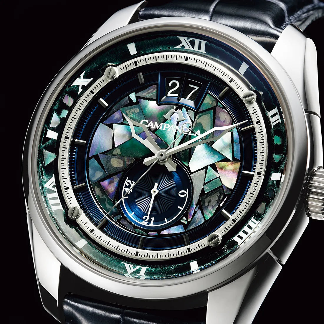 漆地に手作業で一枚一枚切り貝を散りばめ、丹念に磨き上げた文字板と外周部の螺鈿(らでん)細工は、ひとつとして同じ表情がない。