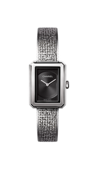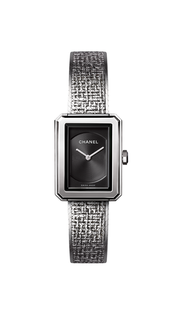 ダイヤル:ブラック ギヨシェダイヤル リュウズ:ステンレススティール、ブラックスピネル カボション ブレスレット:ステンレススティール、ツイードパターン、ダブルフォールディングバックル |
