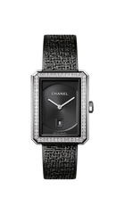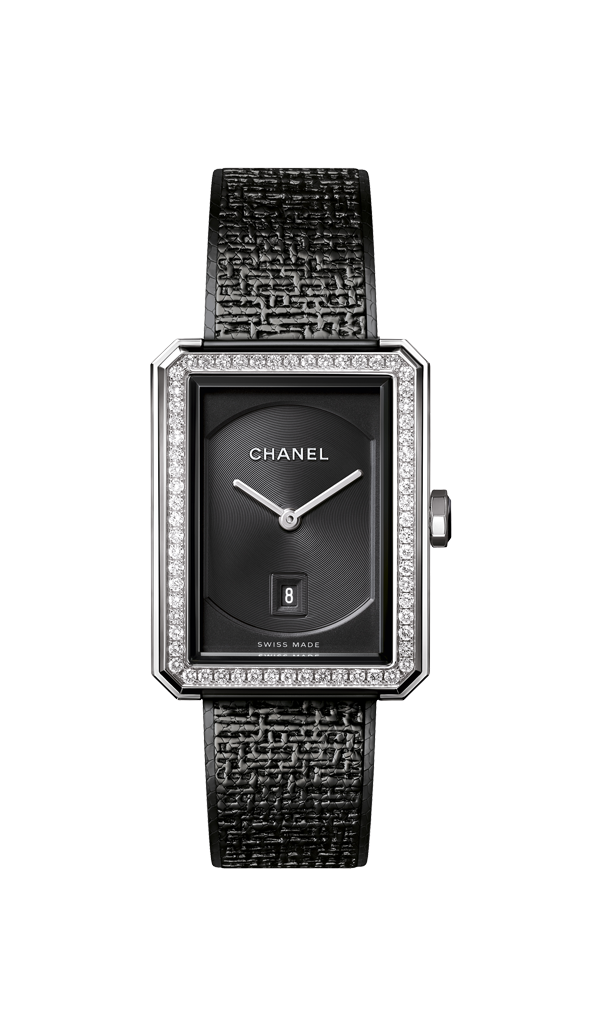 ベゼル:ステンレススティール製ベゼルに64個のブリリアントカット ダイヤモンド(約0.71カラット) ダイヤル:ブラック ギヨシェ ダイヤル、日付表示 ブレスレット:ツイードパターンのブラックコーティング ステンレススティール製ブレスレット、フォールディングバックル |