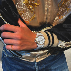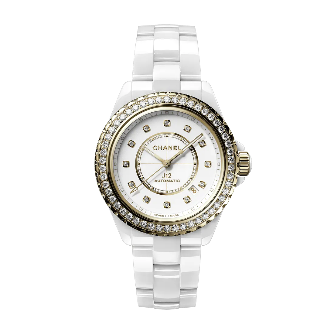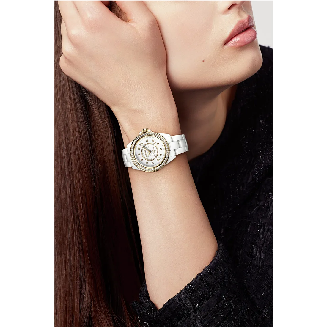 ベゼル:18Kイエローゴールド、固定ベゼル、ブリリアントカット ダイヤモンド50個(約1.51カラット) ダイヤル:ホワイト ラッカー ダイヤル、ダイヤモンド インデックス12個(約0.09カラット) リュウズ:非ねじ込み式リュウズ、18Kイエローゴールド、高耐性ホワイト セラミック カボション ブレスレット:高耐性ホワイト セラミック、ステンレススティール製3重折りたたみ式バックル |