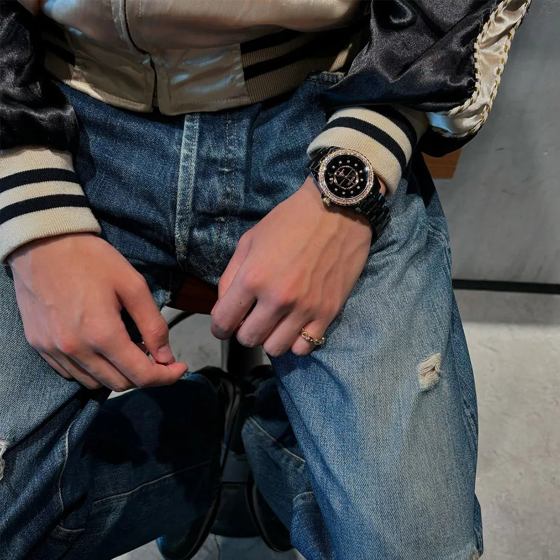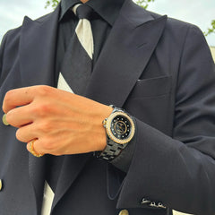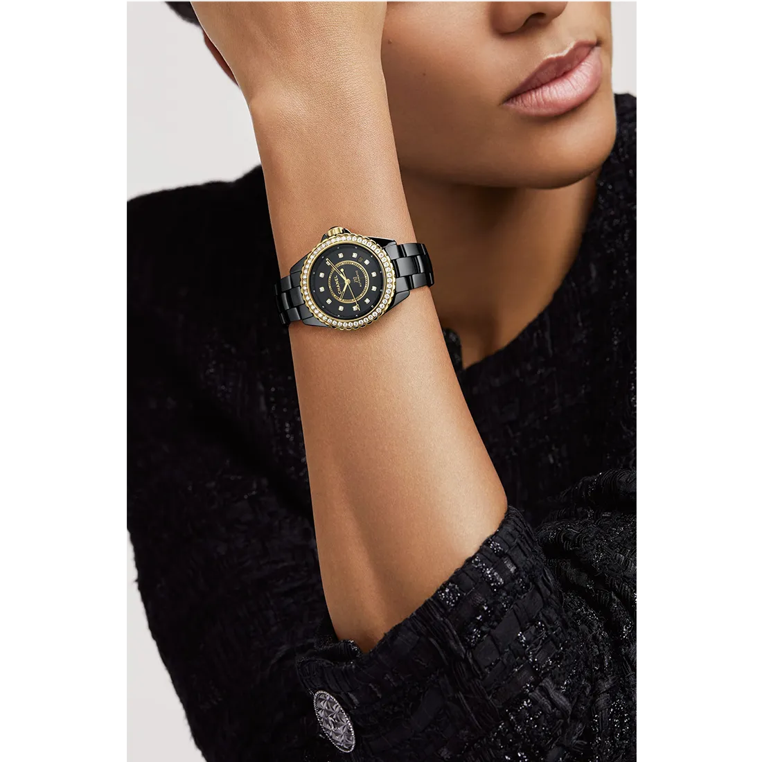 ベゼル:18Kイエローゴールド、固定ベゼル、ブリリアントカット ダイヤモンド50個(約1.51カラット) ダイヤル:ブラックラッカー ダイヤル、ダイヤモンド インデックス12個(約0.09カラット) リュウズ:非ねじ込み式リュウズ、18Kイエローゴールド、高耐性ブラック セラミック カボション ブレスレット:高耐性ブラック セラミック、ステンレススティール製3重折りたたみ式バックル |