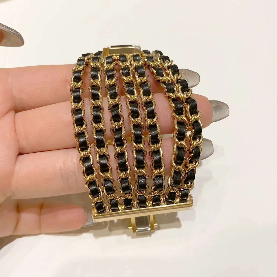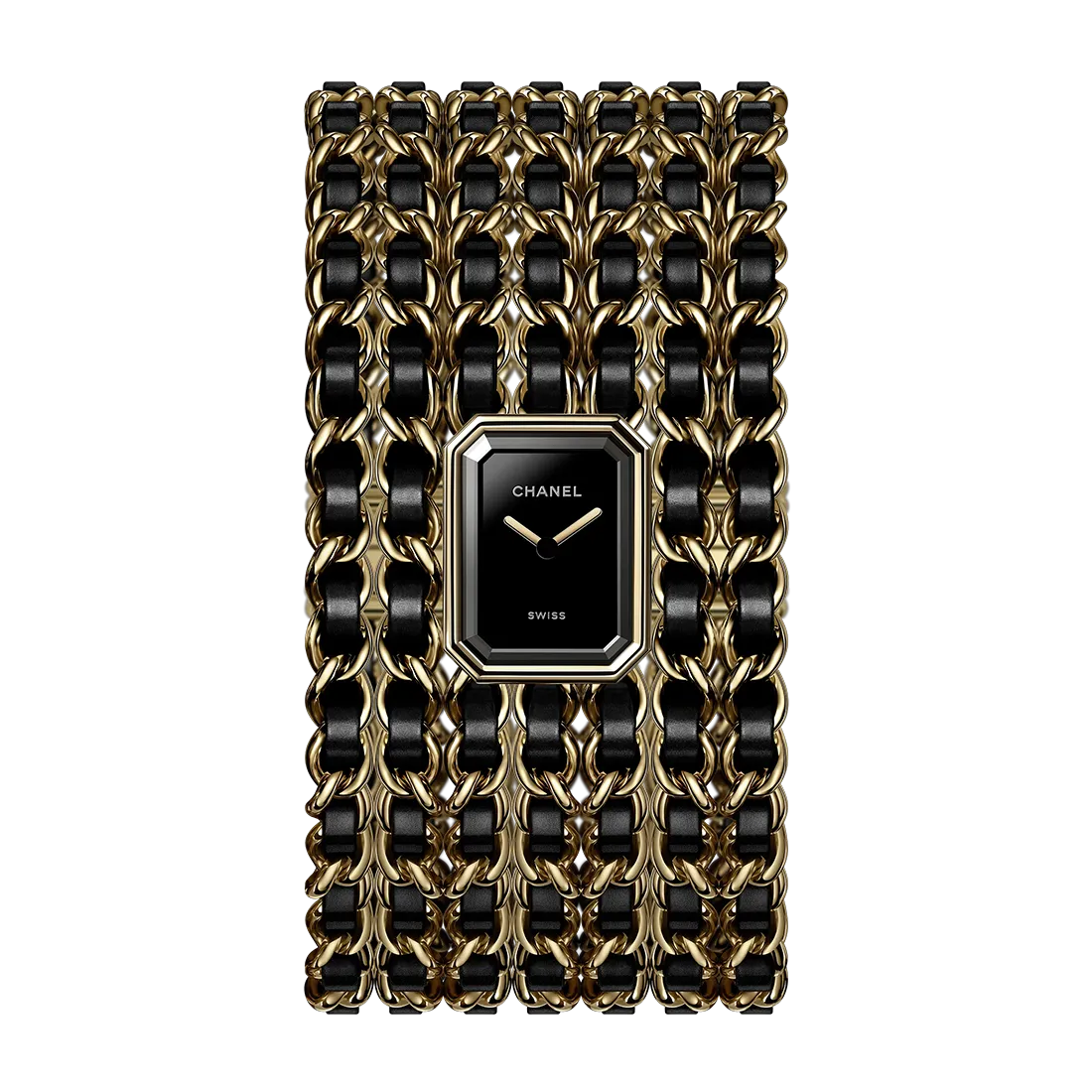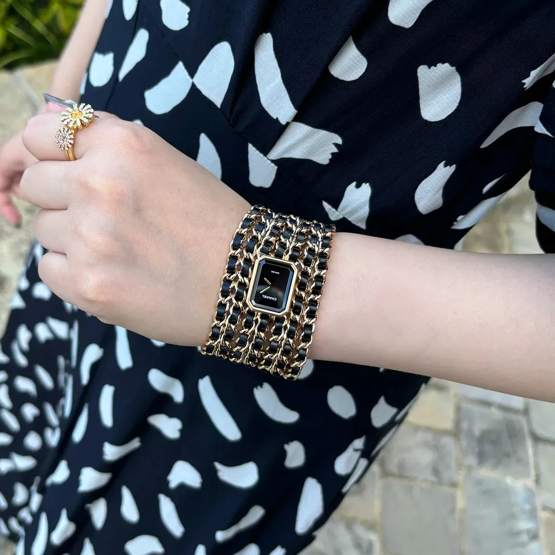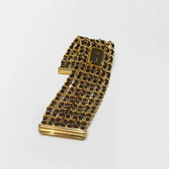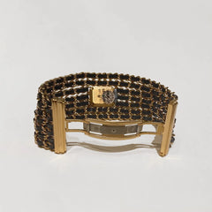 ステンレススティール、18Kイエローゴールドのコーティング(0.1ミクロン) ブレスレット ステンレススティールにブラックレザーを編み込んだチェーンブレスレット、18Kイエローゴールドのコーティング(0.1ミクロン) ダイヤル ブラック ラッカー ダイヤル ムーブメント 高精度クォーツムーブメント |